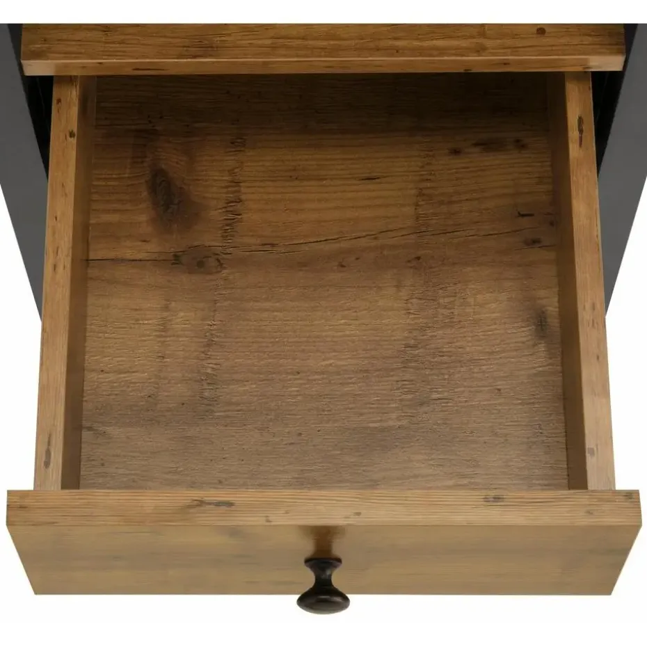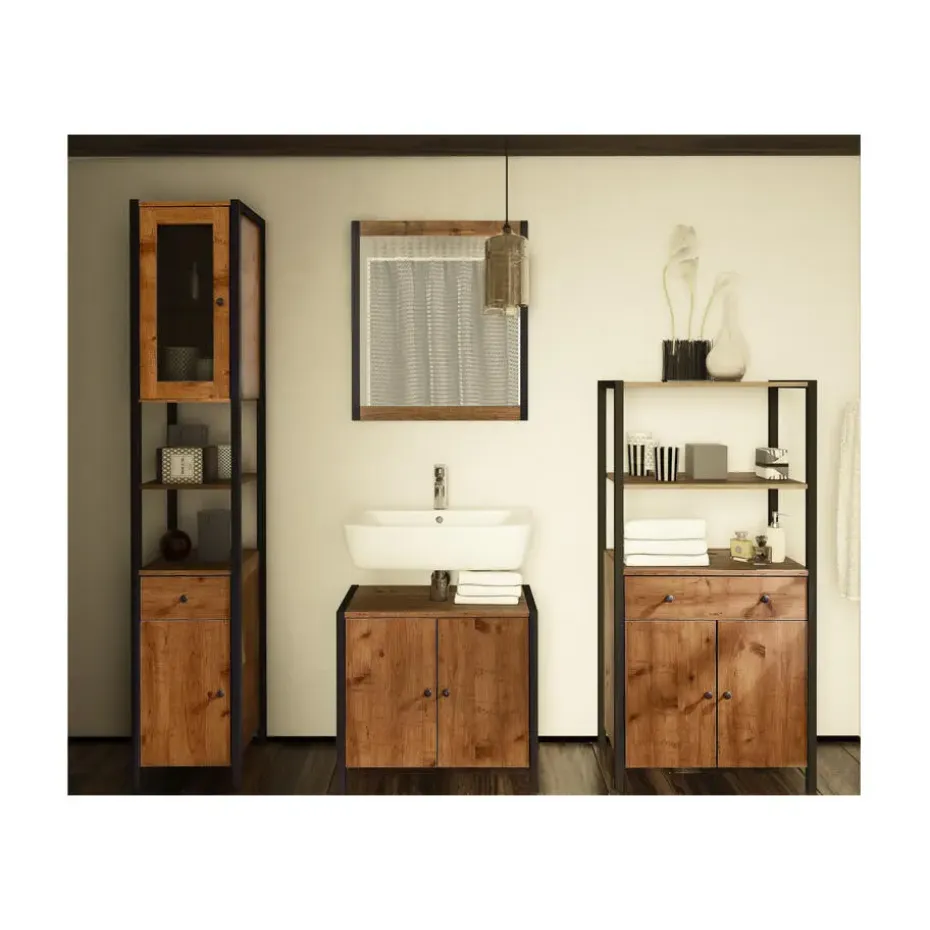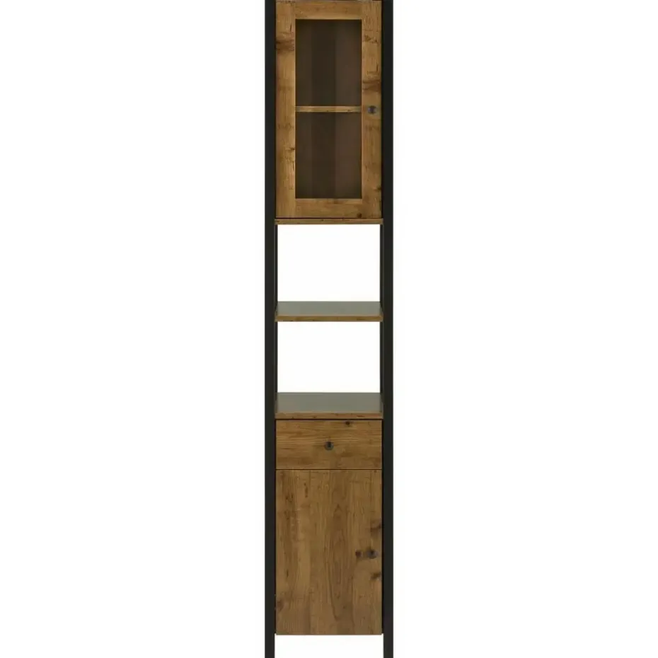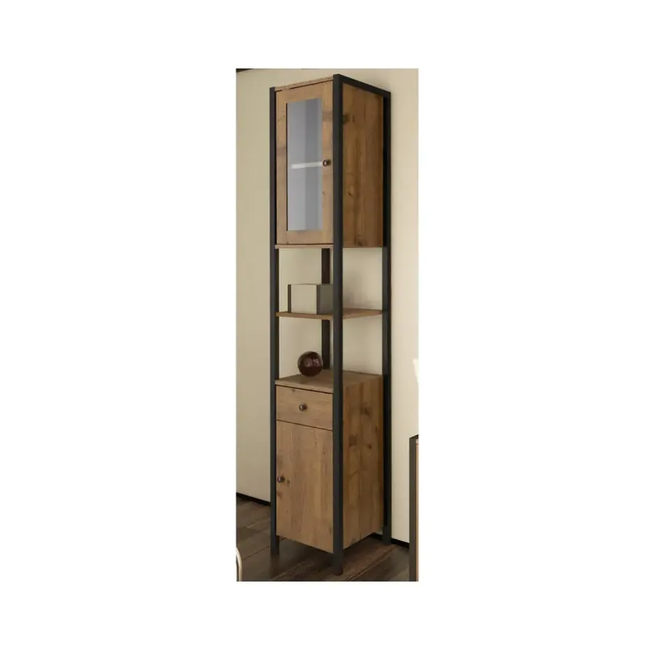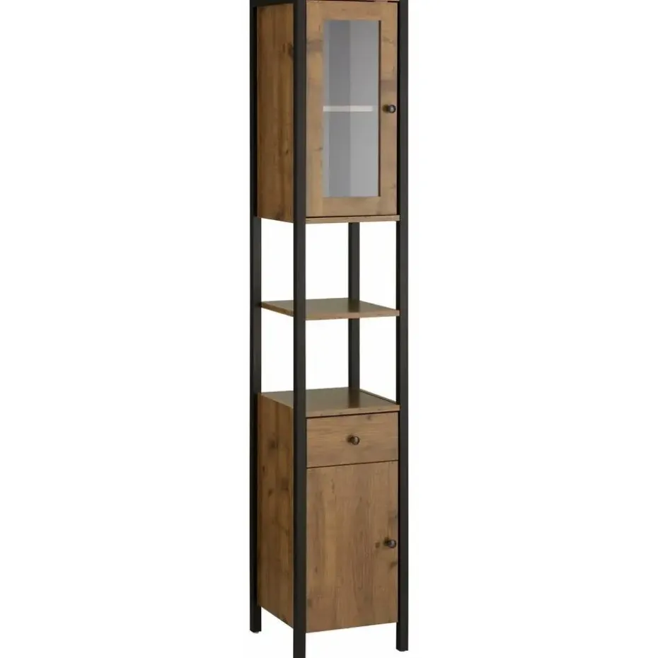 Een elegante hoge kast in gelamineerde spaanplaat met een tijdloos ontwerp. Het ontwerp past zowel in industriële als landelijke interieurs. Geïntegreerde vakken en lades bieden praktische opbergmogelijkheden. Montagemateriaal is inbegrepen, dus hij kan snel worden gemonteerd en geïnstalleerd.