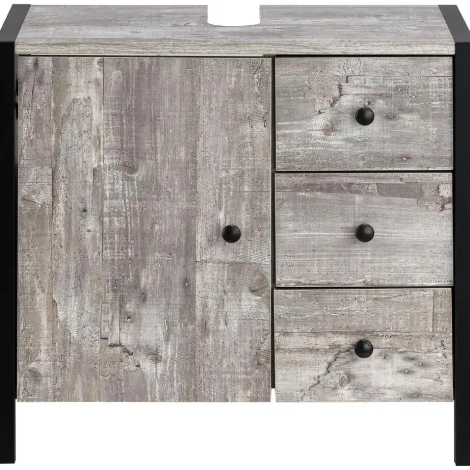 Dit meubel combineert rustieke accenten met industriële charme en biedt voldoende opbergruimte in de badkamer. Het badmeubel springt in het oog met zijn aluminium frame in metallic-look, dat de knopvormige handgrepen aanvult. In de afdekplaat is een praktische uitsparing voor de sifon geïntegreerd, zodat het badkamermeubel direct onder de wastafel geplaatst kan worden. De ruimte in het meubel is functioneel verdeeld in opbergniveaus achter de deur en laden op metalen rails. Het badkamermeubel is gemaakt van FSC®-gecertificeerd hout en is verkrijgbaar in verschillende kleuren.