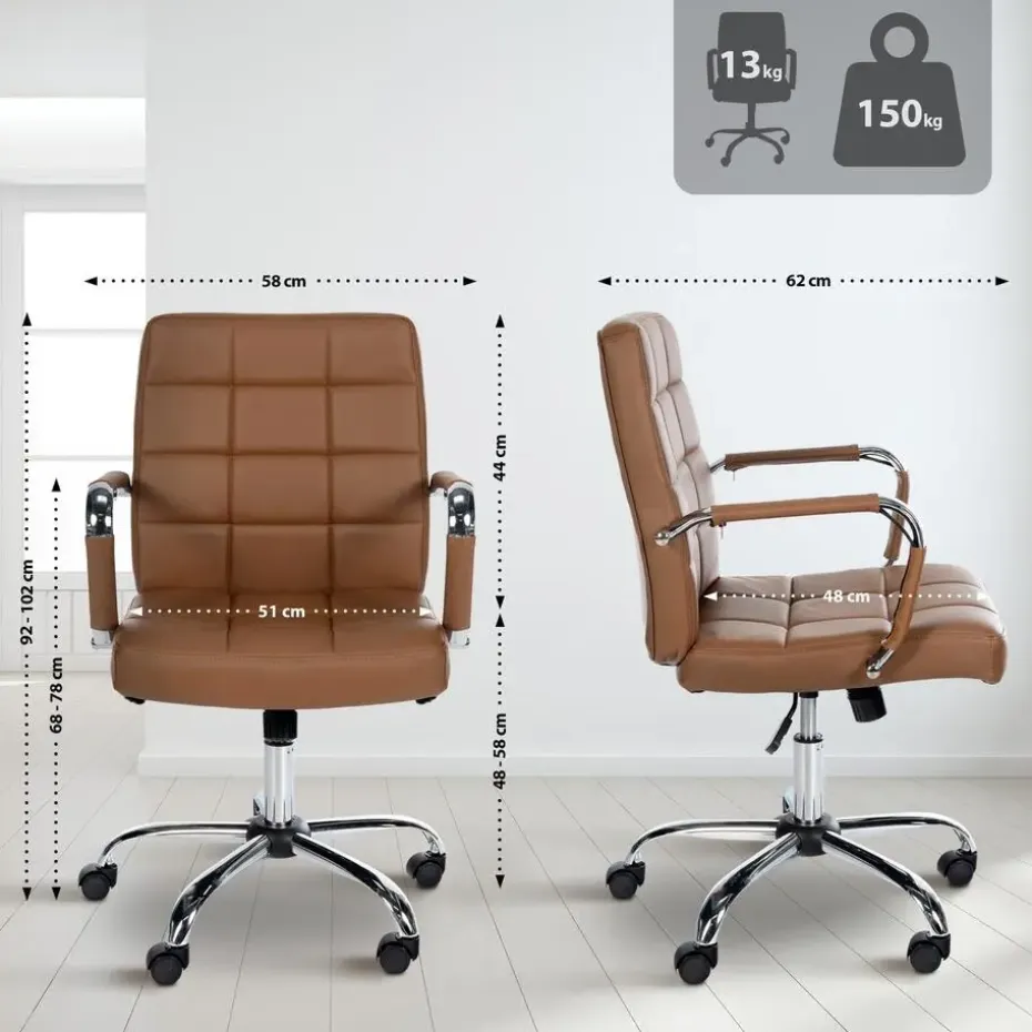 Met armleuningen en een rugleuning biedt hij comfortabele ondersteuning, vooral voor de onderrug. Het stevige metalen frame met lichtlopende wielen zorgt voor stabiliteit en veel bewegingsvrijheid, waardoor de bureaustoel veilig een belasting van 150 kilo kan dragen.