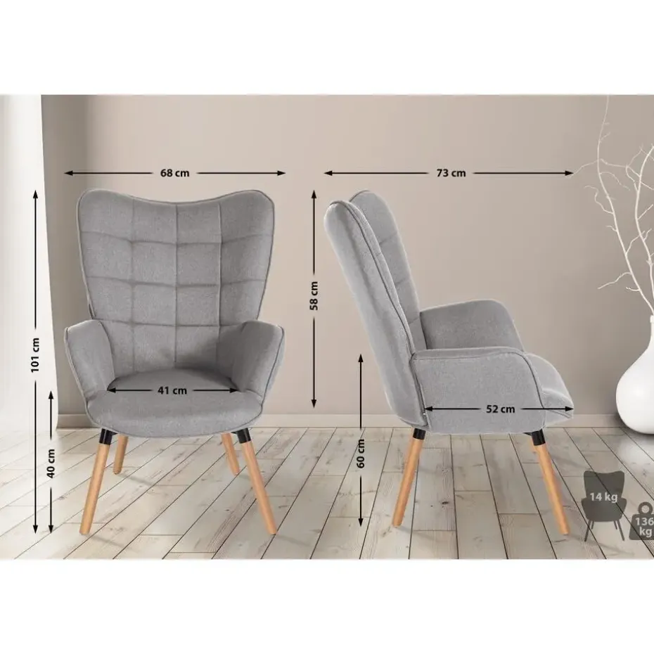 De royale fauteuil overtuigt met een slijtvaste stoffen bekleding in modieuze kleuren en met stabiele poten van licht beukenhout. De hoge rugleuning is een blikvanger met zijn chique gewatteerde patroon, terwijl de rugleuning het zitcomfort aanzienlijk verhoogt.