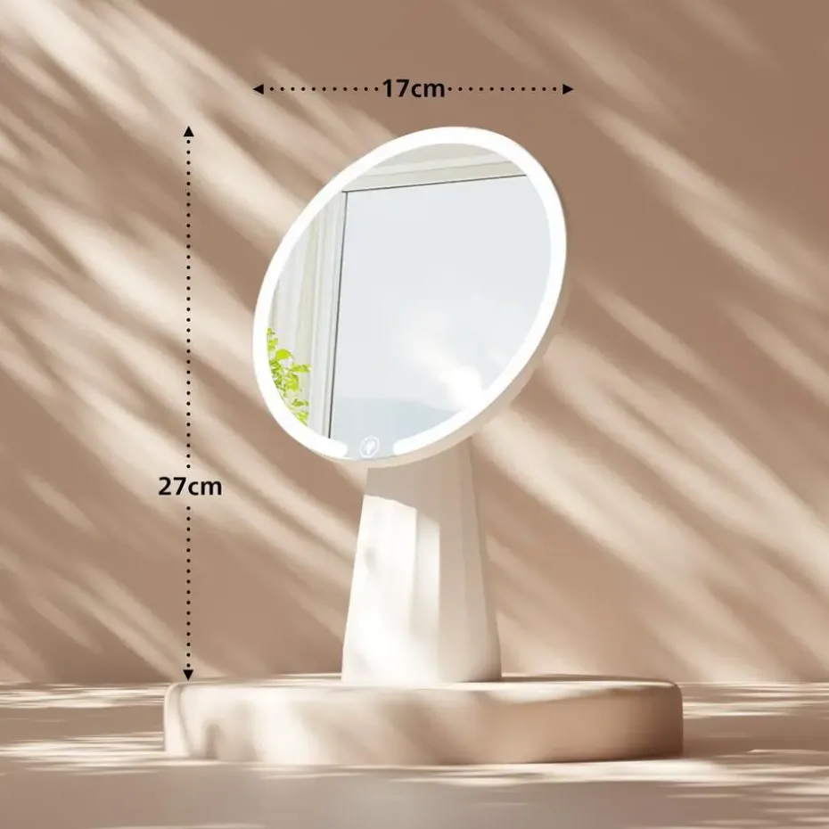 Met zijn ronde behuizing van robuuste en lichte ABS-kunststof past de cosmeticaspiegel visueel in elke moderne woonomgeving. Hij biedt functionaliteit, duurzaamheid en mobiliteit in één.