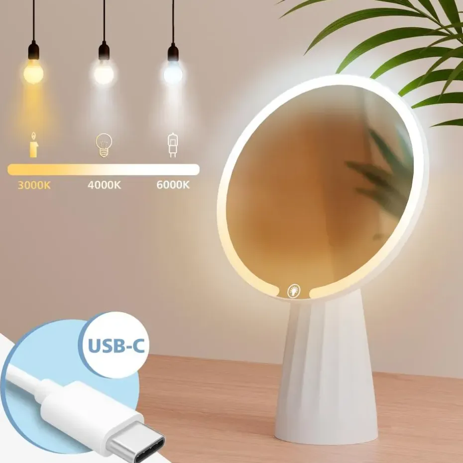 De USB-C-aansluiting maakt eenvoudig en betrouwbaar opladen mogelijk, zonder batterijen. Een bijpassende kabel is inbegrepen. Dankzij het compacte formaat en de stabiele voet is de spiegel veelzijdig inzetbaar, zowel thuis op de kaptafel, in de badkamer als op de make-uptafel.