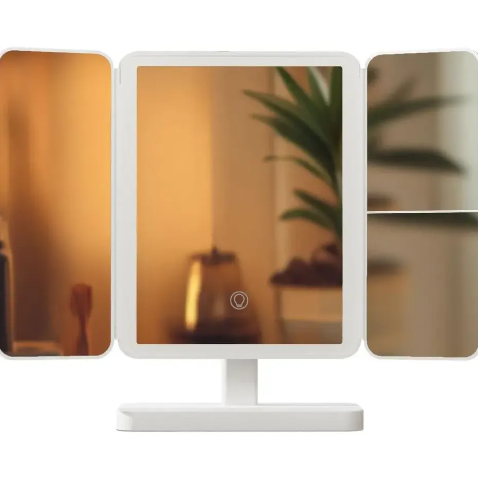 Met zijn hoekige opklapbare behuizing van metaal en glas past de cosmeticaspiegel optisch in elke moderne woonomgeving. Het biedt functionaliteit, duurzaamheid en mobiliteit in één.