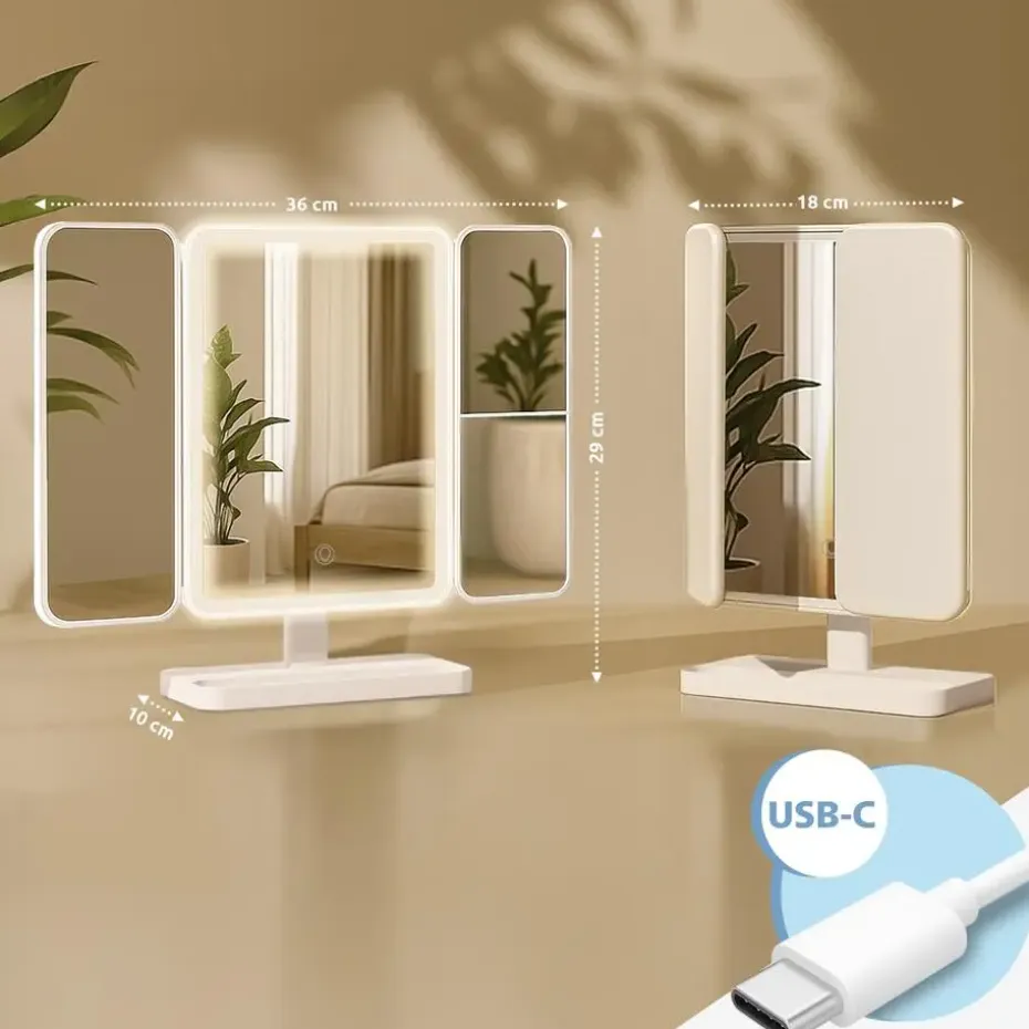 De USB-C-aansluiting maakt eenvoudig en betrouwbaar opladen mogelijk, zonder batterijen. Een passend kabeltje is inbegrepen in de levering. Het compacte formaat en de stabiele voet maken de spiegel veelzijdig inzetbaar, bijvoorbeeld thuis op de kaptafel en in de badkamer.