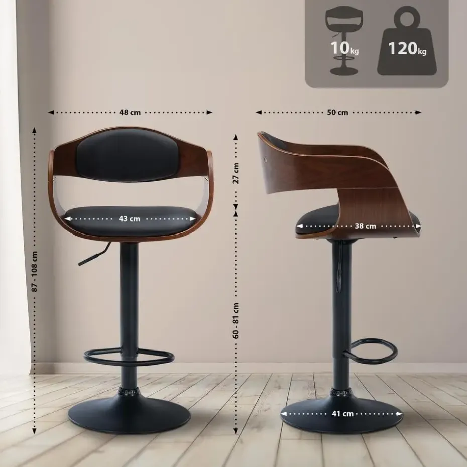 De barkrukken staan ??op robuuste frames van matzwart metaal. Dankzij een gaslift zijn de barkrukken traploos in hoogte verstelbaar en kunnen ze individueel worden aangepast aan elke lichaamsgrootte en baarhoogte. De geïntegreerde voetsteunen dragen bij aan een rechte en opgerichte zithouding.