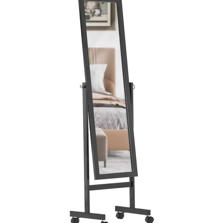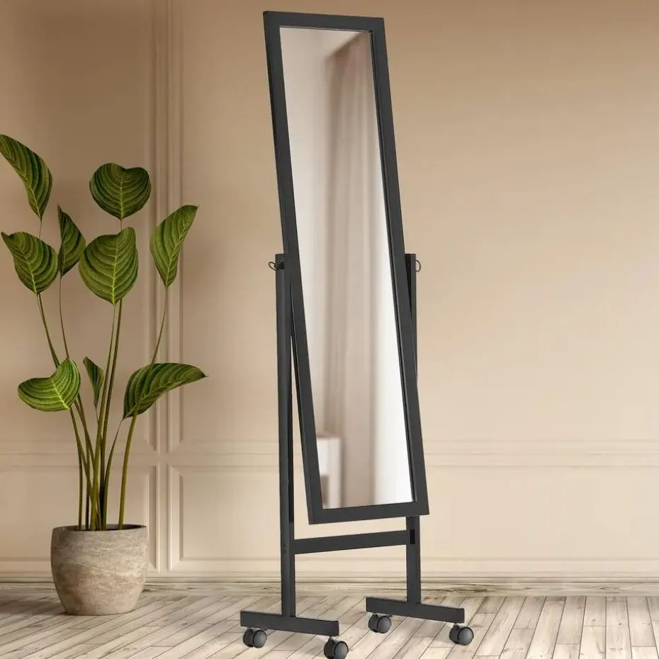 gelakt massief houten frame, staat de spiegel over de hele lengte op vier kunststof kunststof wielen die 360 graden kunnen draaien. Hierdoor is de spiegel gemakkelijk te verplaatsen.