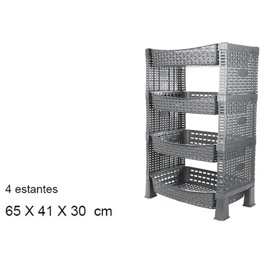 Deze 3-laagse opbergrek is een praktische en stijlvolle oplossing voor extra opbergruimte in de keuken. Het opbergrek is gemaakt van kunststof. Met zijn compacte afmetingen past hij perfect in kleinere keukens, badkamers, of andere ruimtes waar je opbergruimte nodig hebt. Het rek heeft luchtgaatjes in de schappen en dat zorgt voor goede ventilatie, handig voor in de keuken als je hem gebruikt om fruit en groente op te bewaren. Met dit opbergrek creeer je extra opbergruimte waar je maar wilt, en de 4-laagse indeling maakt hem veelzijdig en ideaal voor dagelijks gebruik in elke ruimte van het huis! Afmeting trolley: ca. 65 x 41 x 30 cm. Materiaal: kunststof. Merk: Casa Menaje. Kleur: grijs.