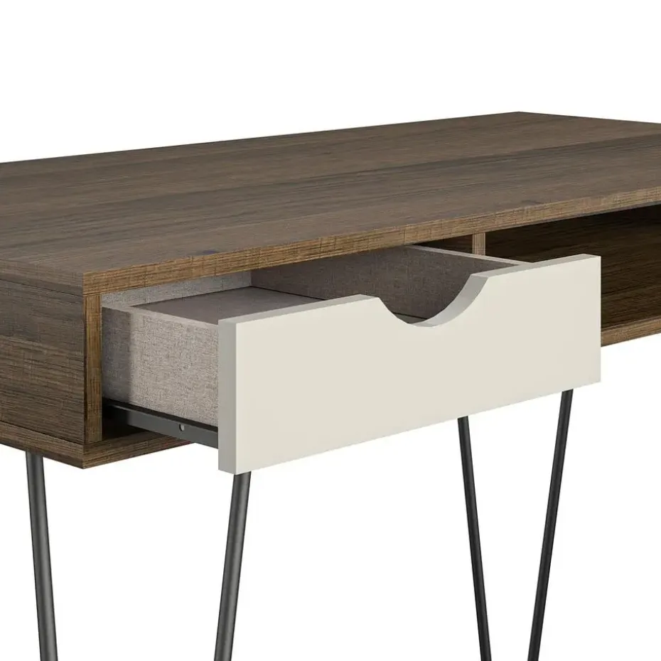 Voeg een mid-century stijl toe aan je interieur met dit computerbureau met opbergruimte. Geïnspireerd door mid-century design, combineert de klassieke houtnerf afwerking van het gelamineerde spaanplaat met de zwarte metalen haarspeldpoten voor een retro touch.
