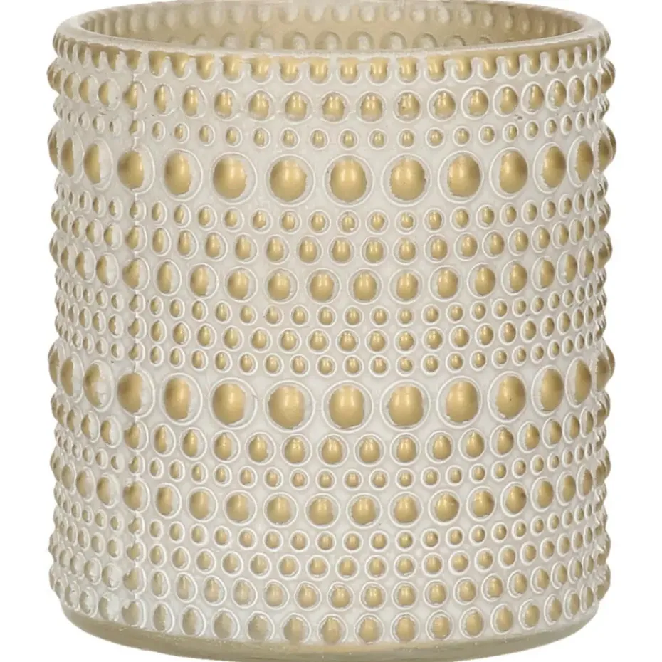 Luxe theelichthouder of kaarsenhouder voor waxinelichtjes van licht doorschijnend relief glas in de kleuren creme wit/goud. Afmetingen: D7 x H8 cm. Plaats meerdere formaten en of meerdere stuks van deze serie bij elkaar op een kaarsenbord voor een maximale en stijlvolle sfeer. Serie: Aurora.