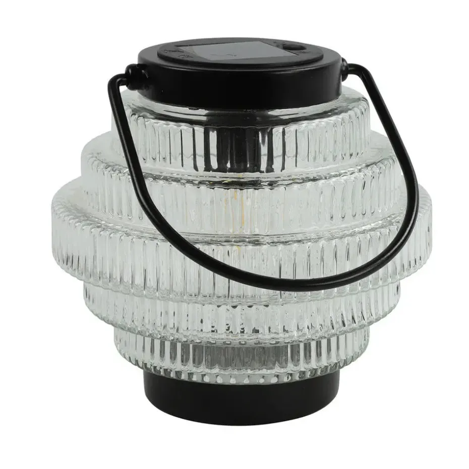 Solar tuin lantaarn Jardin, met een moderne vorm in de kleuren transparant/zwart. Zet de lantaarn op een zonnig plekje in de tuin, bijvoorbeeld op de tuintafel. Hoe meer zon er op het zonnepaneel schijnt, hoe beter en langer de lantaarn brandt. Gemiddeld geeft de lamp 6 uur lang licht. Tevens zit er een schakelaar op de lantaarn waarmee de verlichting aan en uit gezet kan worden. LED kleur: warm wit. Materiaal: metaal/glas. Diameter: ca. 16 cm. Hoogte: ca. 16 cm. Merk: Countryfield.