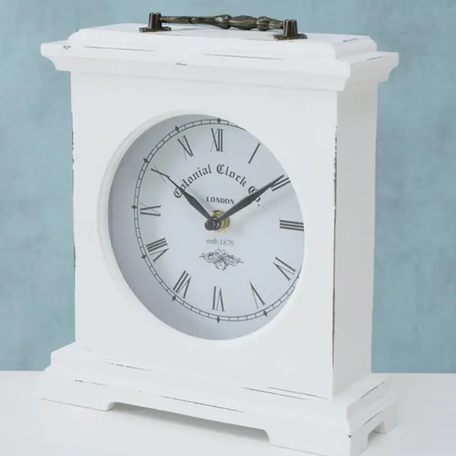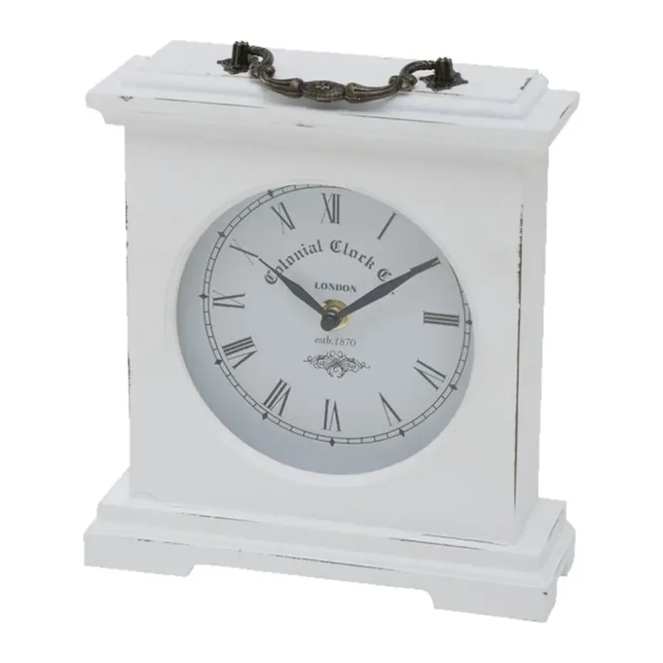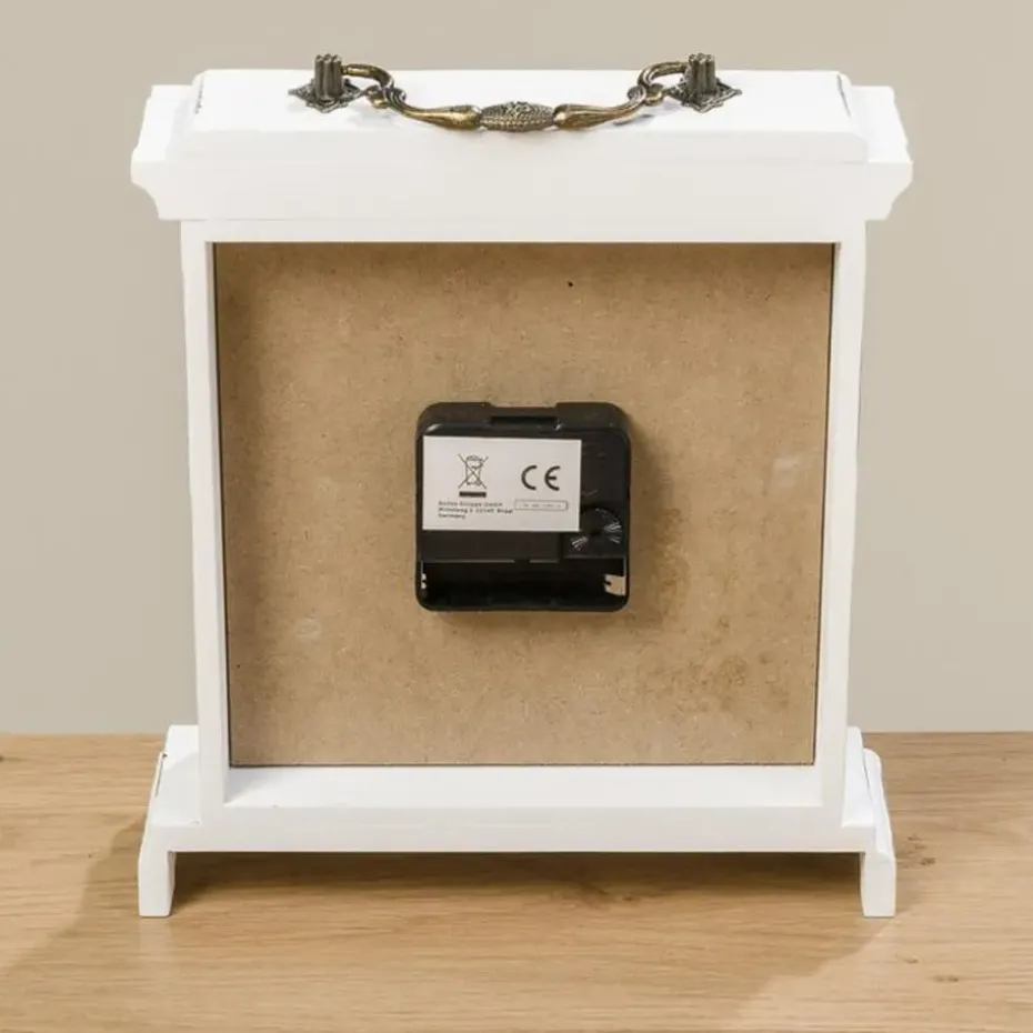 Tafelklok staand model St James gemaakt van hout en glas. Kleur: antiek wit. Afmetingen ongeveer: 23 x 21 cm. Aantal benodigde batterijen: 1x AA, niet inbegrepen. Staande klokken voor in de woonkamer, kantoor of slaapkamer. Stijlvolle historische uitstraling. Een absolute verrijking van uw kantoor of huis interieur.