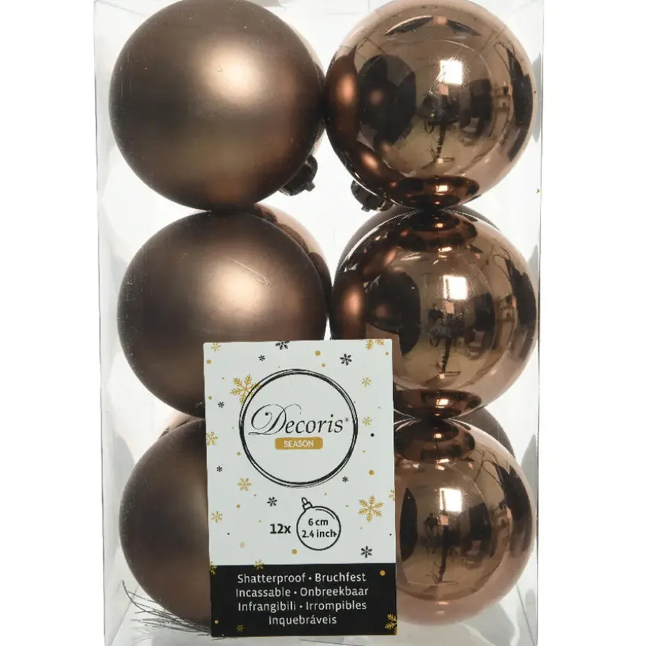 12x stuks kunststof kerstballen walnoot bruin 6 cm glans/mat. Set van onbreekbare kerstballen in een mix van glanzende en matte kerstballen. Onze kerstballen worden standaard geleverd met ophangdraadjes maar wij adviseren u om onze kerstbalhaakjes mee te bestellen niet inbegrepen. Materiaal: kunststof/plastic. Formaat diameter: 6 cm.Kerstboomversiering.