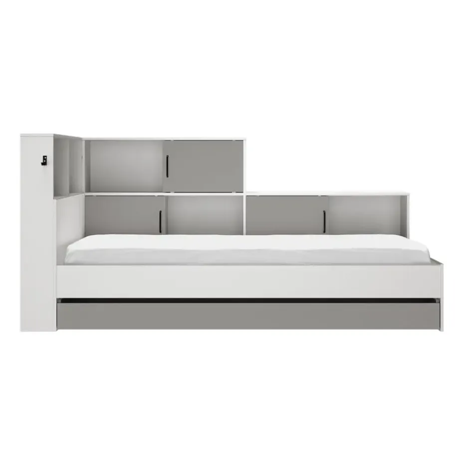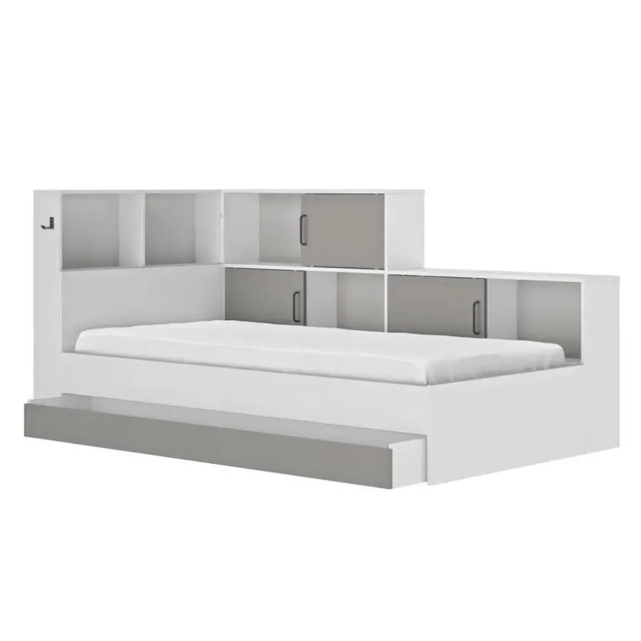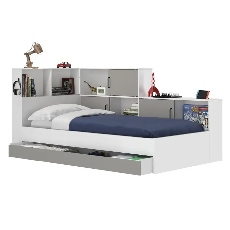 De opberglade over de hele lengte van het bed maakt het gemakkelijk om kleding, speelgoed en andere dagelijkse voorwerpen op te bergen, terwijl de grote opbergplanken aan 2 zijden van het bed extra ruimte bieden voor boeken, tijdschriften en decoratieve voorwerpen. Sommige planken zijn voorzien van schuifdeuren voor discrete en esthetische opslag.