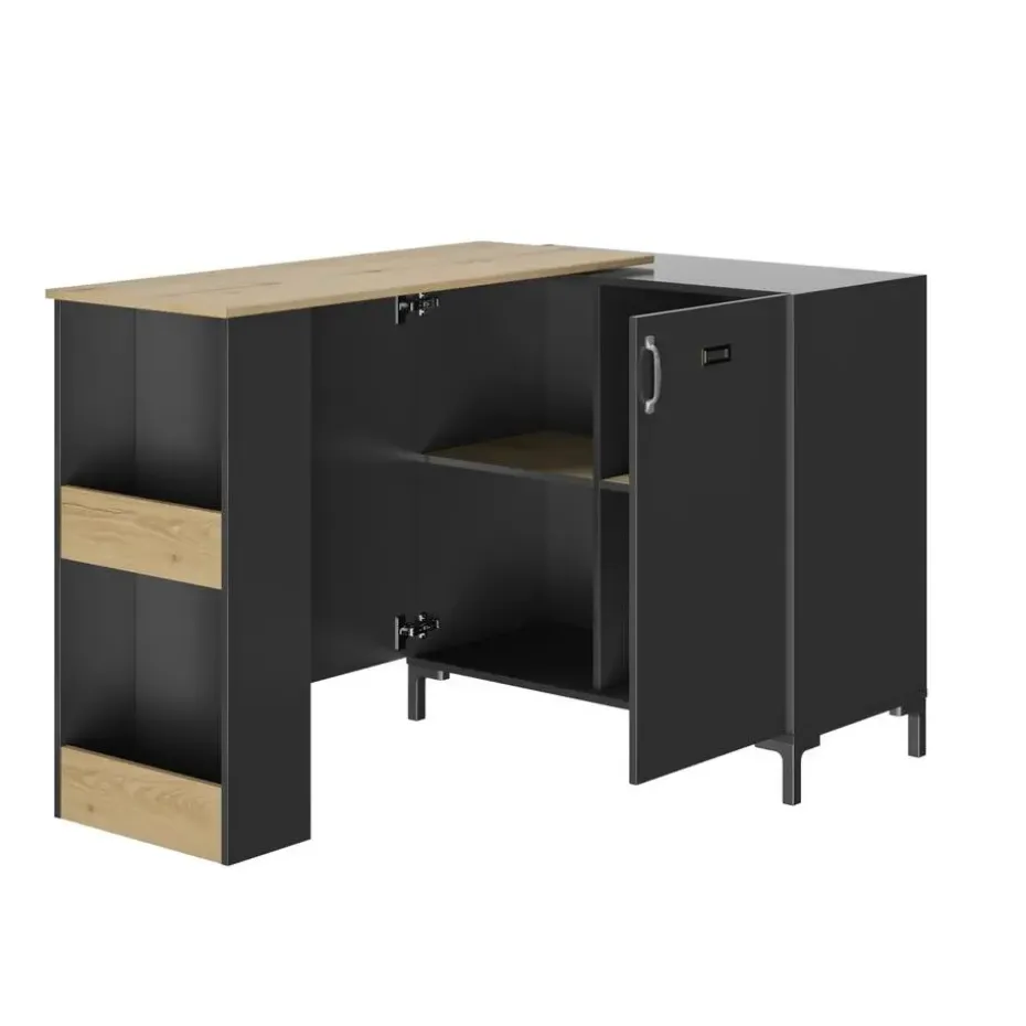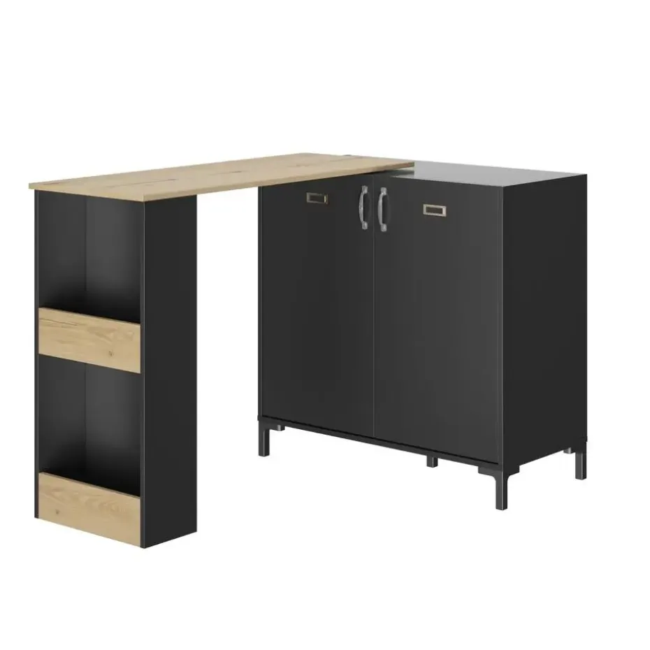 De draaibare bar tafel met 2 deuren MANCHESTER is een kwaliteitsmeubel gemaakt in Frankrijk. Het draaibare tafelblad biedt twee open opbergzones, perfect voor het opbergen van flessen of andere dagelijkse voorwerpen. De grote gesloten opbergruimte is verdeeld in vier zones met in hoogte verstelbare planken voor een gepersonaliseerde organisatie. De twee metalen labeldeuren voegen een industriële touch toe aan het geheel, terwijl de zwarte en eiken bi-tone een uitgesproken stijl geeft.
