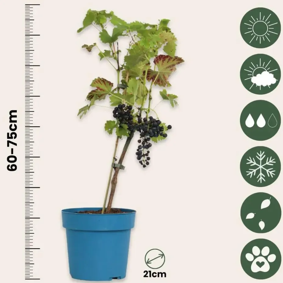 De Vitis vinifera ‘Nero’ is een goed producerende rode druif. De Nero staat bekend om zijn knapperige donkerblauwe druiven, welke heerlijk zijn om meteen te eten of een heerlijke rode wijn van te maken. Deze winterharde, krachtige wijnstok is makkelijk te verzorgen en is zelfbestuivend. De Vitis vinifera ‘Nero’ is een ideale buitendruif voor drogere locaties.