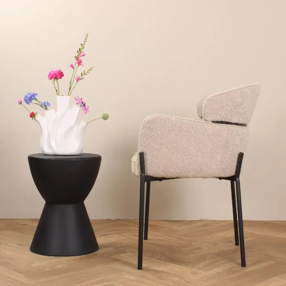 Ontdek de nieuwste toevoeging aan ons assortiment: de Mira eetkamerstoel! Deze prachtige stoel combineert comfort en stijl op een verbluffende manier. Met zijn weelderige bouclé stof voegt hij een vleugje luxe toe aan elke ruimte, terwijl de unieke rugleuning zorgt voor optimale ondersteuning tijdens langdurig zitten. Wat de keuze betreft, heb je de luxe om te kiezen uit drie kleuren: beige, zand en roestbruin. Of je nu een intiem diner organiseert of een gezellig samenzijn met vrienden hebt, de Mira stoel is de perfecte metgezel. Upgrade jouw eetruimte met de Mira stoel en geniet van een mix van elegantie en comfort.