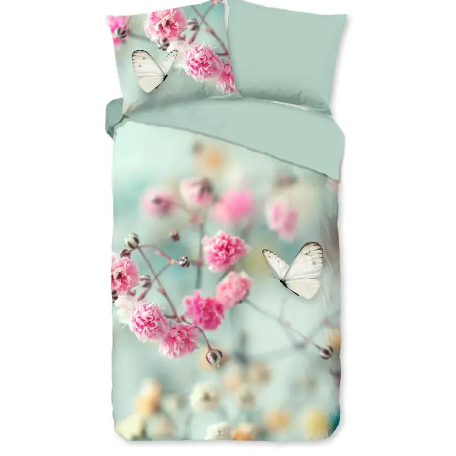 Dekbedovertrek Adel van Good Morning met bloemen en vlinders, in de kleur mint. Dit is gemaakt van 100% katoen. De kwaliteit is ademend, vochtabsorberend en voelt zacht en soepel aan. Dit mooie dekbedovertrek fleurt iedere slaapkamer op en is geschikt voor elk jaargetijde. Het katoenen dekbedovertrek is heerlijk koel in de zomer en geeft warmte in de winter.
