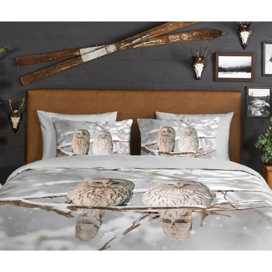 Flanellen dekbedovertrek Febe van Good Morning, in de kleur grijs, met een print van uilen in winterlandschap. Het dekbedovertrek is gemaakt van 100% katoen/flanel dat is licht geruwd, waardoor een fluweelzacht laagje ontstaat dat heerlijk warm aanvoelt -perfect voor koude nachten.