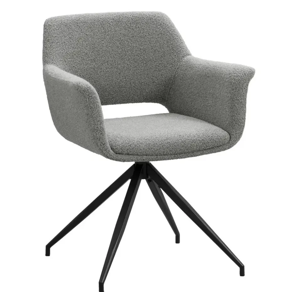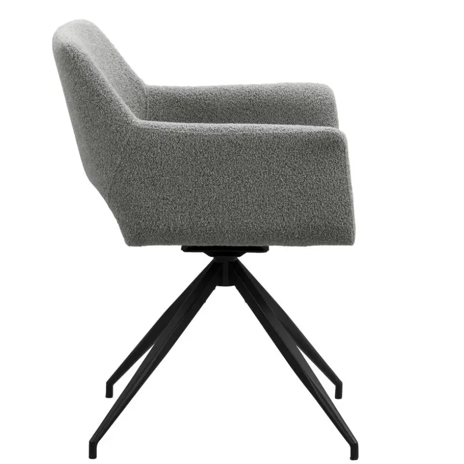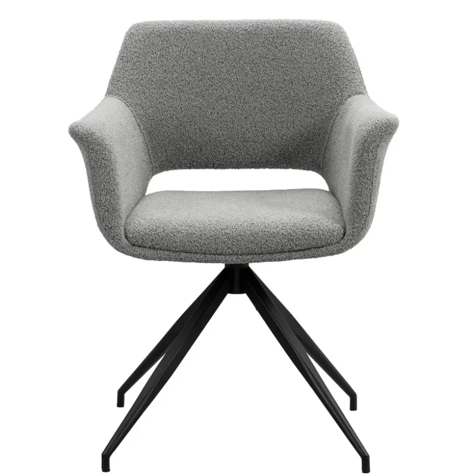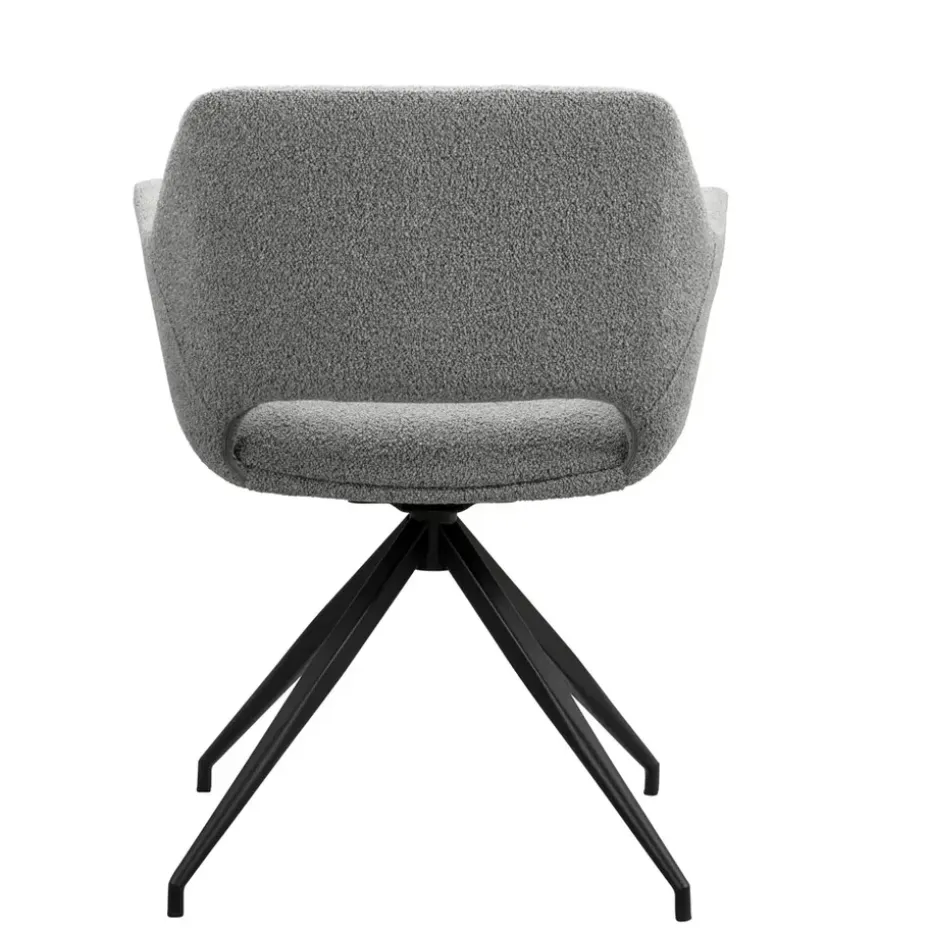 Eetkamerstoel Belle is een elegante stoel met een klassiek design. Met zijn lichtgrijze bekleding en zwarte metalen poten past deze stoel in ieder interieur. Door zijn open rug heeft de stoel een open en frisse, eigentijdse uitstaling. De armleuningen en rugleuningen zorgen voor extra comfort en door het draaibare onderstel van 180 graden, met terugdraaifunctie, kun je makkelijk aanschuiven en uren blijven tafelen. Voeg een vleugje stijl toe aan jouw eetkamer!