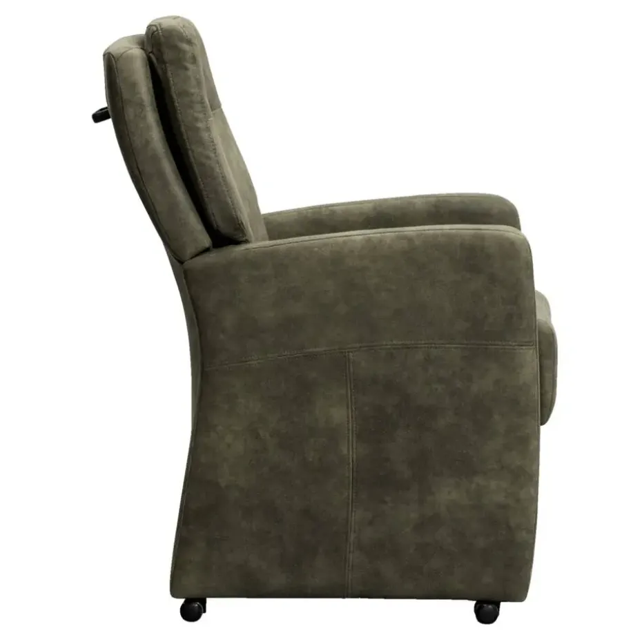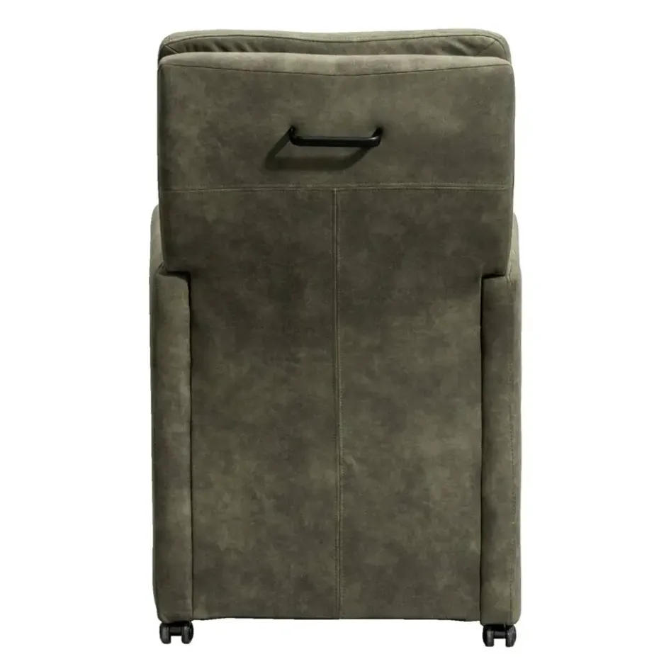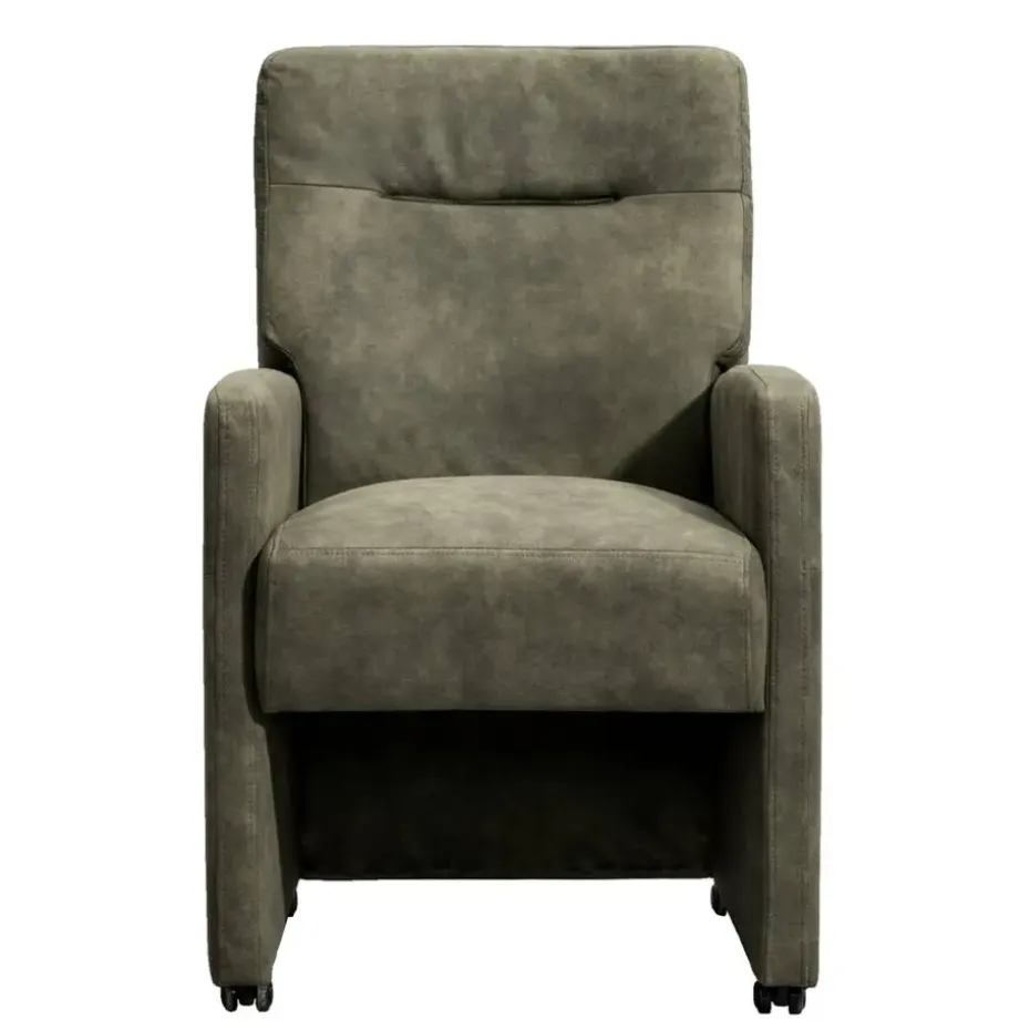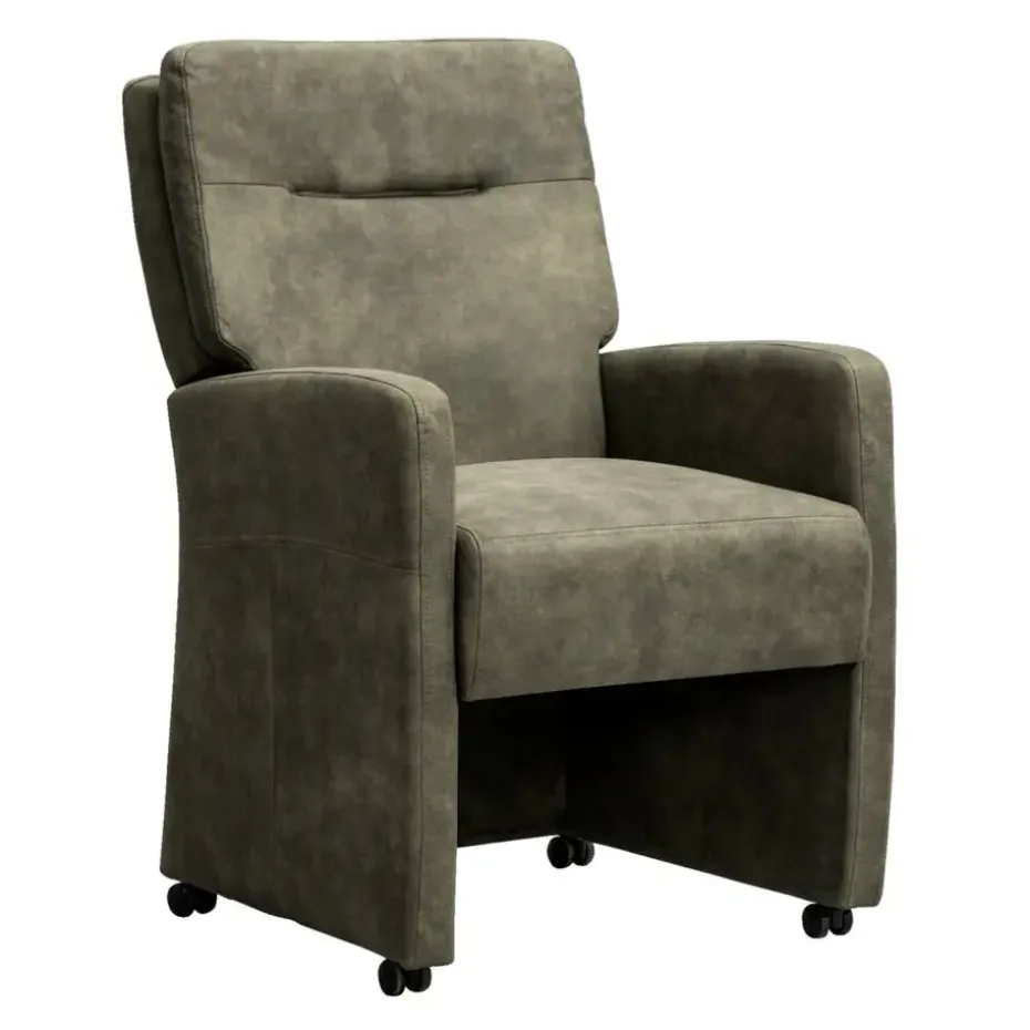 Eetkamerstoel Daniel is een stoere zeer comfortabele eetkamerfauteuil. Deze stoel is vervaardigd uit een groen kleurige preston stof. Preston is een zachte stof met een natuurlijk patroon dat lijkt op leder. De comfortabele zitting met armleuningen, de hoge rug en de handige wieltjes zorgen ervoor dat je avonden achter elkaar kan genieten van het (na)tafelen.