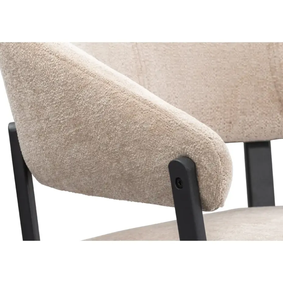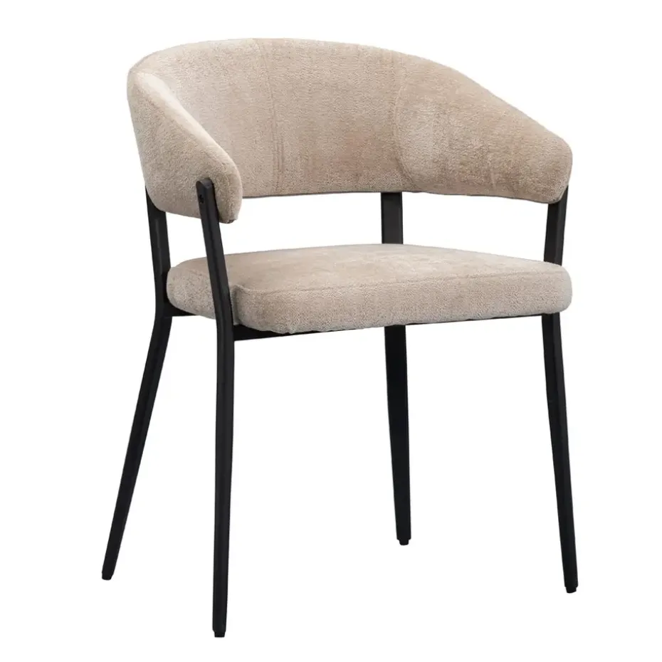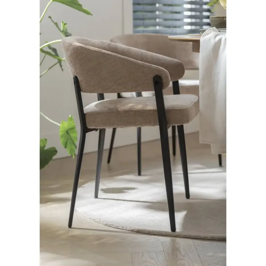 Wanneer je op zoek bent naar een moderne eetkamerstoel, dan is Eetkamerstoel Liv perfect voor jou. Met haar caramel kleurige bekleding en zwarte metalen poten past deze stoel in ieder interieur. Liv heeft ronde vormen en een open rugleuning waardoor de stoel een frisse uitstaling krijgt. De metalen poten en zachte bekleding geven de stoel een trendy look en door de comfortabele armleuningen kun je uren tafelen. Makkelijk onder te tafel te schuiven en verkijgbaar in verschillende kleuren.