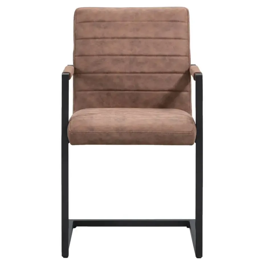 Eetkamerstoel Lizzy is bekleed met een cognackleurige stof die door de stiksels ook fraai oogt. Deze stoel is voorzien van comfortabele armleuningen, die ook zijn bekleed met dezelfde stof. Wil je je armen laten rusten tijdens het (na)tafelen, dan zijn stoelen met armleuning ideaal voor jou. Ook als je werkt aan je eetkamertafel is het prettig om je armen te ondersteunen. Het metalen slede onderstel zorgt voor een licht verende zitting. Extra comfortabel dus.