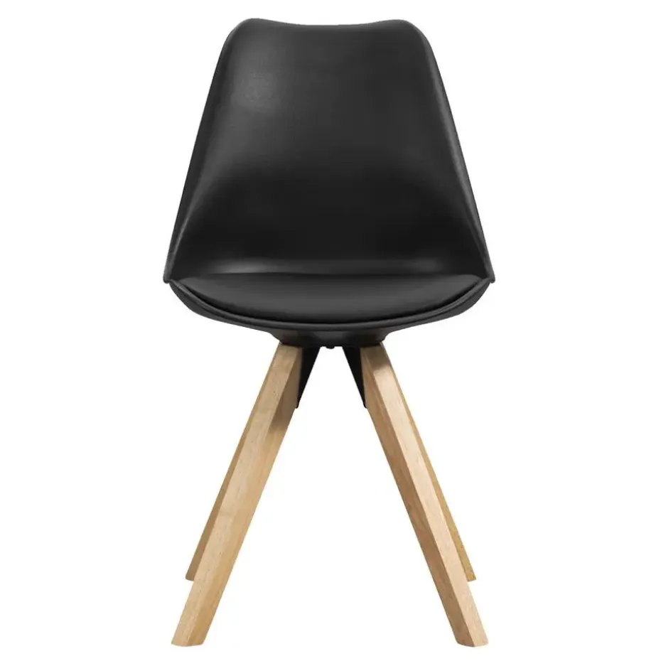 Eetkamerstoel Senja is zwart met een houten onderstel. Deze moderne stoel is gemaakt van kunststof, dus gemakkelijk te reinigen met een vochtig doekje.