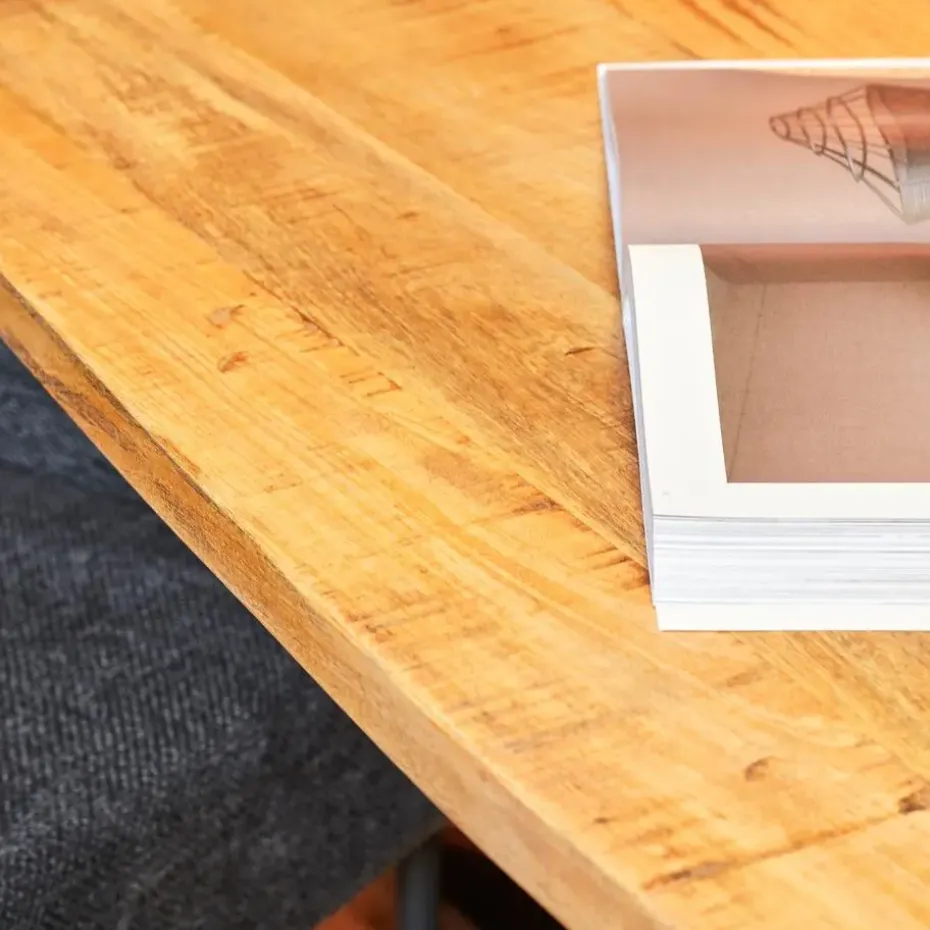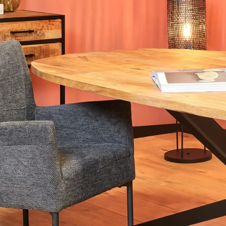 Materiaal: Deze eettafel is vervaardigd uit mangohout, een duurzaam en stevig materiaal dat bekend staat om zijn unieke nerfpatronen en warme uitstraling. Het tafelblad is gelakt, wat bijdraagt aan de bescherming en de levensduur van het hout.