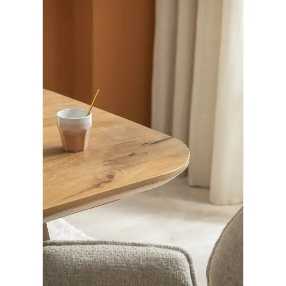 Eettafel Mandy is de perfect eettafel voor jouw woonruimte! Het tafelblad is gemaakt van mangohout en is rechthoekig, afgewerkt met ronde hoeken. Een tijdloos en simpel design dat past bij ieder interieur, van minimalistisch tot scandinavisch. Het mangohout geeft de tafel een warme uitstraling en is leuk af te stylen met ons ruime assortiment eetkamerstoelen. Houdt bij het kiezen van eetkamerstoelen rekening met de ruimte tussen de twee tafelpoten, dit is 142 cm. Eettafel Mandy heeft een afmeting van 75x220x94cm.