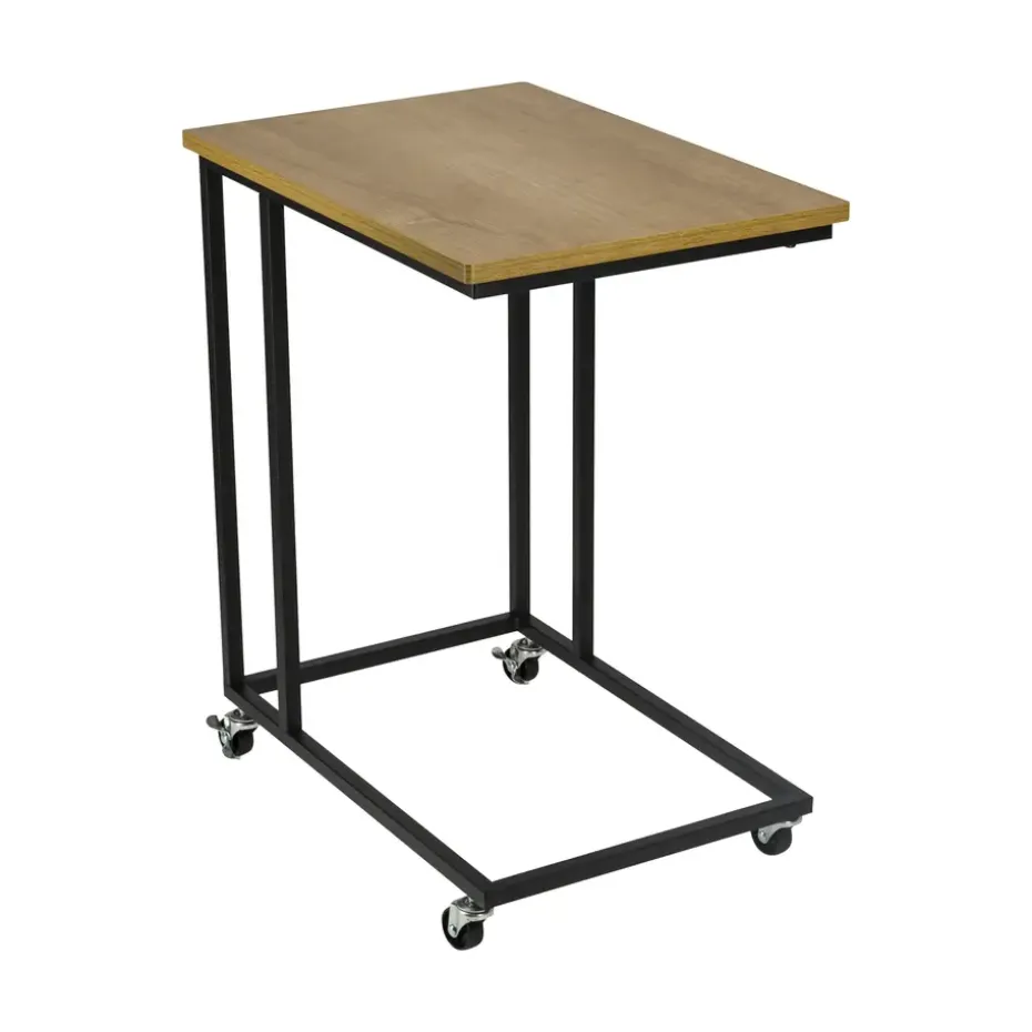 De ERRO bijzettafel wordt geleverd met wieltjes én met verstelbare voetjes. Zo kun je zelf kiezen wat voor jou het fijnst werkt. Ze zijn gemakkelijk te monteren dus je kunt op een later moment ook nog wisselen. Het metalen frame heeft een mooie mat zwarte poedercoating en de spaanplaat plank heeft een hout dessin.