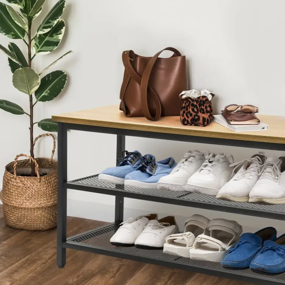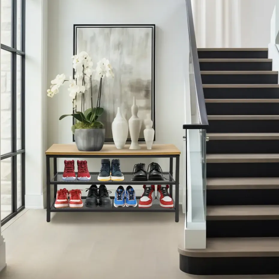 Het ontwerp van het ERRO schoenenrek zorgt voor een stoere uitstraling die perfect past in elk interieur. De combinatie van hoogwaardig mat zwart metaal en houten accenten geeft het schoenenrek een duurzame constructie.