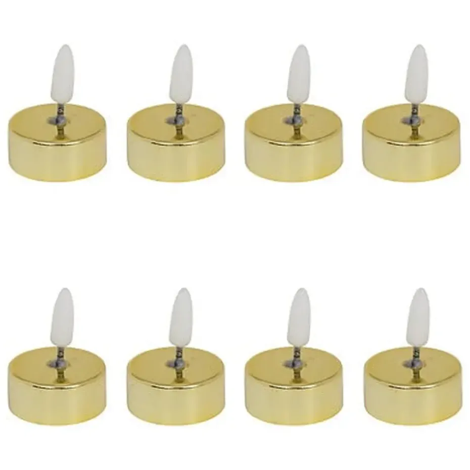 LED theelichtjes 8x stuks in de kleur goud. Breng sfeer en veiligheid samen met deze stijlvolle LED theelichtjes in glanzend goud. Deze set van waxinelichtjes heeft een luxe uitstraling, zonder open vuur of rook. Elk lichtje is 5,5 cm groot en werkt op een meegeleverde 3V knoopcelbatterij (CR2032 of CR2034). Ideaal voor sfeervolle avonden, feestjes of decoratie rondom de feestdagen. Herbruikbaar, energiezuinig en veilig – ook in huishoudens met kinderen of huisdieren.