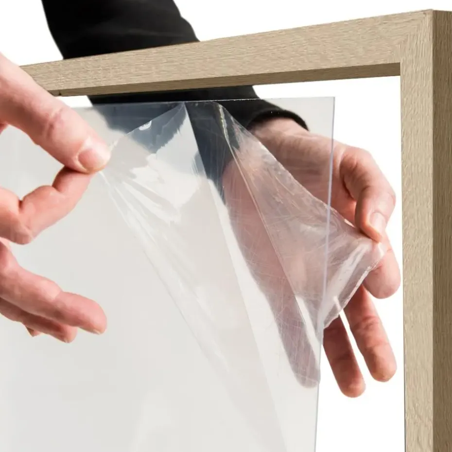 Om het plexiglas te beschermen tijdens het transport, is het langs beide kanten van een folie voorzien. Deze folie is voor gebruik gemakkelijk te verwijderen.