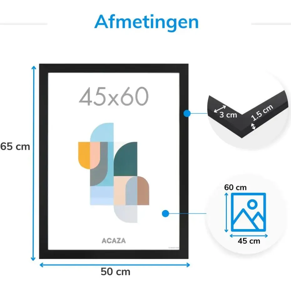 – Materiaal: frame in MDF hout, plexiglas, metalen bevestigingsclips