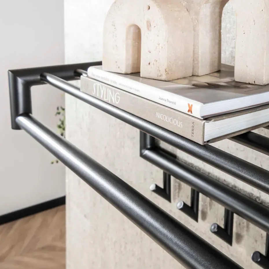 Deze kapstok heeft een ronde buis, uitgevoerd in donkergrijs mat gepoedercoat staal. De hoedenplank bestaat uit meerdere van deze ronde buizen en in totaal heeft dit model 10 gelaste haakjes. Deze kapstok kan door middel van twee bevestigingspunten eenvoudig aan de wand worden gemonteerd. Deze kapstok heeft ook een 20- haaks uitvoering.