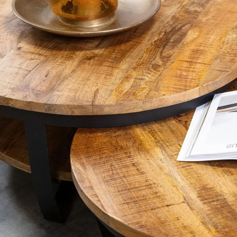 Deze salontafel heeft een stoere en krachtige look. Twee bladen in mangohout rusten op een robuust metalen, zwart gecoat frame. De opbouw is zeer bijzonder, de tafel is een heuse eyecatcher. Deze look is typisch industrieel, maar je kunt deze tafel perfect ook in een moderne omgeving plaatsen. Ze doet zelfs ietwat modernistisch of zelfs futuristisch aan. De ronde vormen kunnen bijvoorbeeld een tegengewicht vormen in een zeer strakke woning. Combineer met deze tafel met zwarte of mangohouten elementen zoals zwarte zitmeubels, muurdecoratie, zwarte verlichting of kasten.
