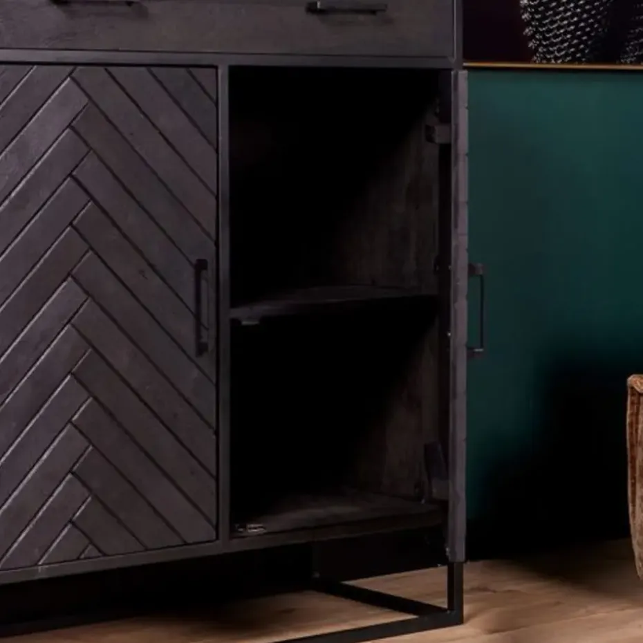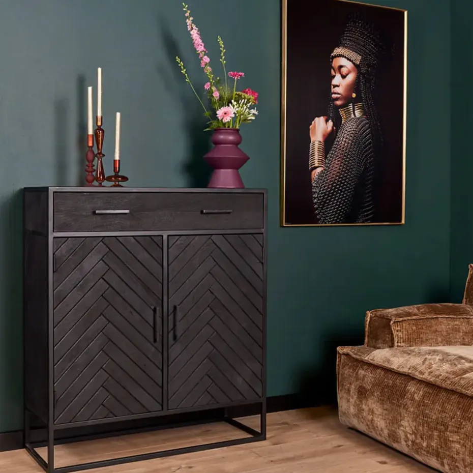 Een wandkast als deze is heel stoer en tegelijk elegant. De zwarte afwerking is zeer bijzonder en geeft aan je interieur een robuuste look. Je bergt er heel wat spullen in op. Achter de deuren vind je legplanken. Combineer deze zwarte kast met wanddecoratie en vloerkleden met zwart. Ga voor zwarte kaarsenhouders of vazen om je Scandi wandkast aan te kleden. Kies er een stoere vloerlamp bij. Ze plaatst de kast nog meer in de kijker.