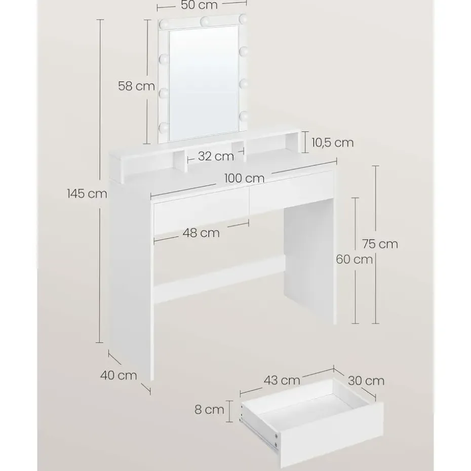 De zijwanden zijn verstevigd met een plaat aan de achterkant die een stabiele structuur creëert zonder dat de kaptafel begint te wiebelen bij elke beweging die je maakt of wanneer er iets op wordt gezet. Bovendien is er ook nog eens genoeg ruimte links en rechts om al je cosmetische producten neer te zetten. De verlichting kan worden ingesteld naar de gewenste helderheid, waardoor je altijd goed geïnformeerde beslissingen over jouw make-up kunt nemen.