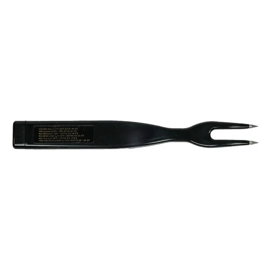 Met de kunststof thermometervork van Garden Grill haal je een handig hulpmiddel in huis voor perfect gegaard vlees. Deze thermometer werkt eenvoudig met 2 AA-batterijen (niet inbegrepen). Je steekt de tanden van de vork in het dikste deel van het vlees, zo dicht mogelijk bij het midden, en houdt ze 15-20 seconden vast. De temperatuur wordt vervolgens weergegeven in een van de handige vakjes: PORK/POULTRY, WELL DONE, MEDIUM WELL, MEDIUM, MEDIUM RARE, RARE of VERY RARE. Zo weet je altijd precies hoe gaar je vlees is, zonder giswerk. Ideaal voor jouw volgende barbecue of culinaire avond!