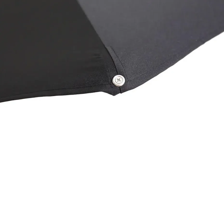 De totale hoogte van deze parasol is 250 cm, de doorloophoogte is 205 cm. De afmetingen van het zwart kleurige doek zijn: Ø350 cm.