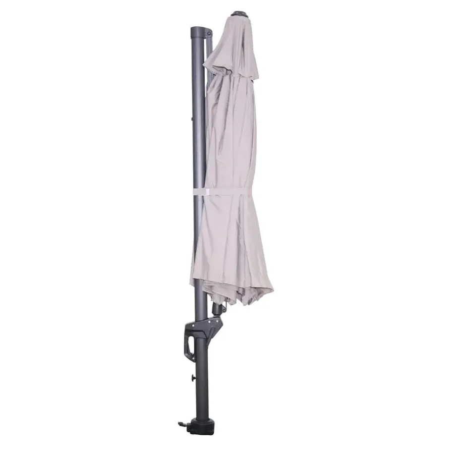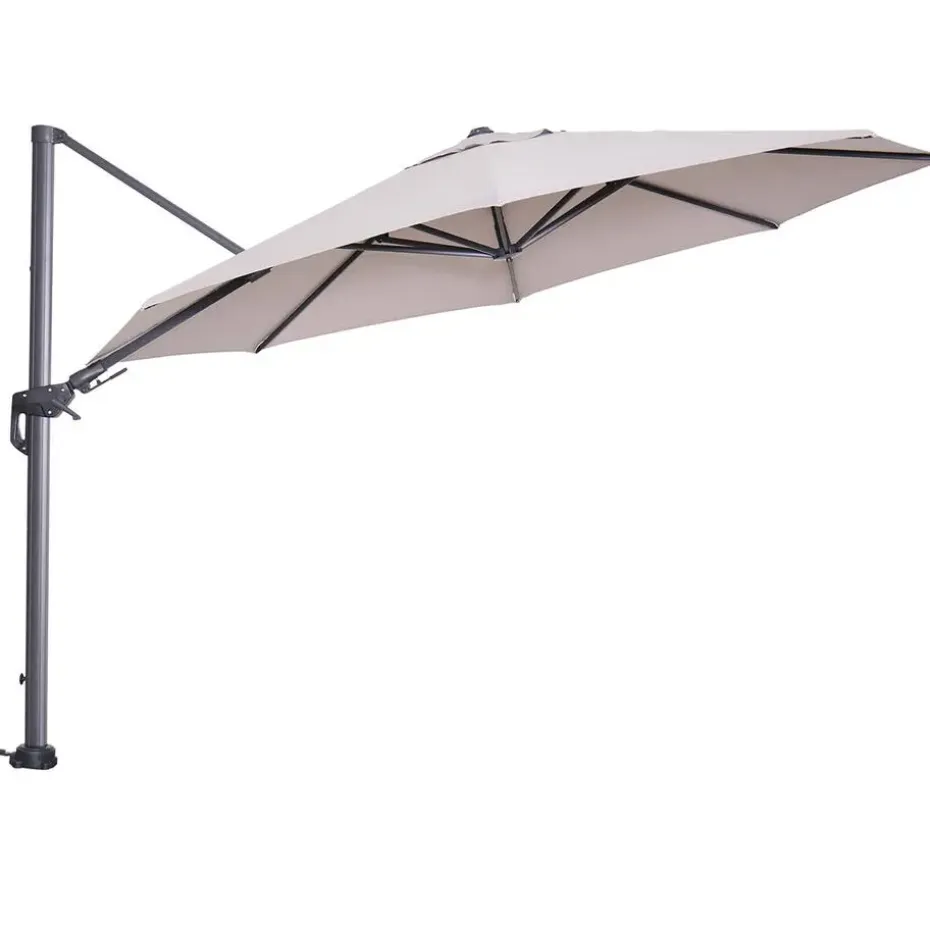 De parasol beschikt over een 250 grams polyester doek wat zorgt voor bescherming tegen de zon. Verkleuring van het doek door de zon is na verloop van tijd niet tegen te gaan. Bovendien is het doek voorzien van een brandwerende PA-coating en een windvanger, zodat de wind goed weg kan als deze onder de parasol komt. Het parasoldoek is spatwaterdicht. Het dikke aluminium frame is voorzien van een hoogwaardige kwaliteit poeder coating. Deze coating is dusdanig sterk dat het kras- en stootvast is. De baleinen van de parasol zijn voorzien van doekspanners, zodat het doek mooi strak wordt gehouden.