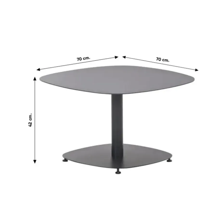 De Kariko loungetafel is gemaakt van aluminium dat bewerkt is met een coating. Het onderstel van deze loungetafel heeft een carbon black coating en het tafelblad een donker grijze coating. Doordat deze gehele loungetafel gemaakt is van aluminium is deze eenvoudig te verplaatsen. Aluminium is licht van gewicht en onderhoudsvrij. Aluminium kan vies zijn geworden door opspattend regenwater of gemorst drinken bijvoorbeeld. Dit is eenvoudig schoon te maken met een sopje en een zachte doek. De loungetafel is 70 x 70 x 43 cm.