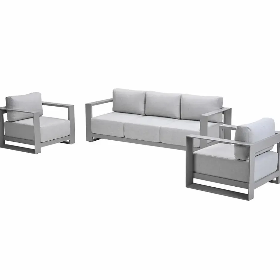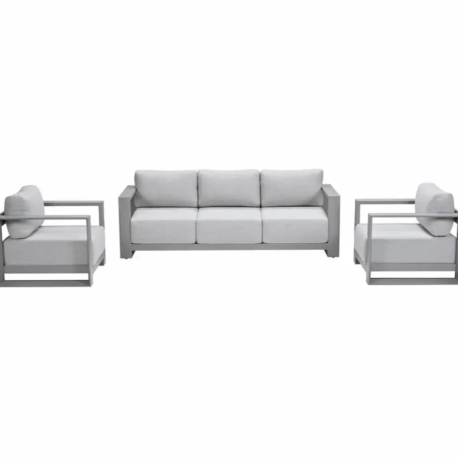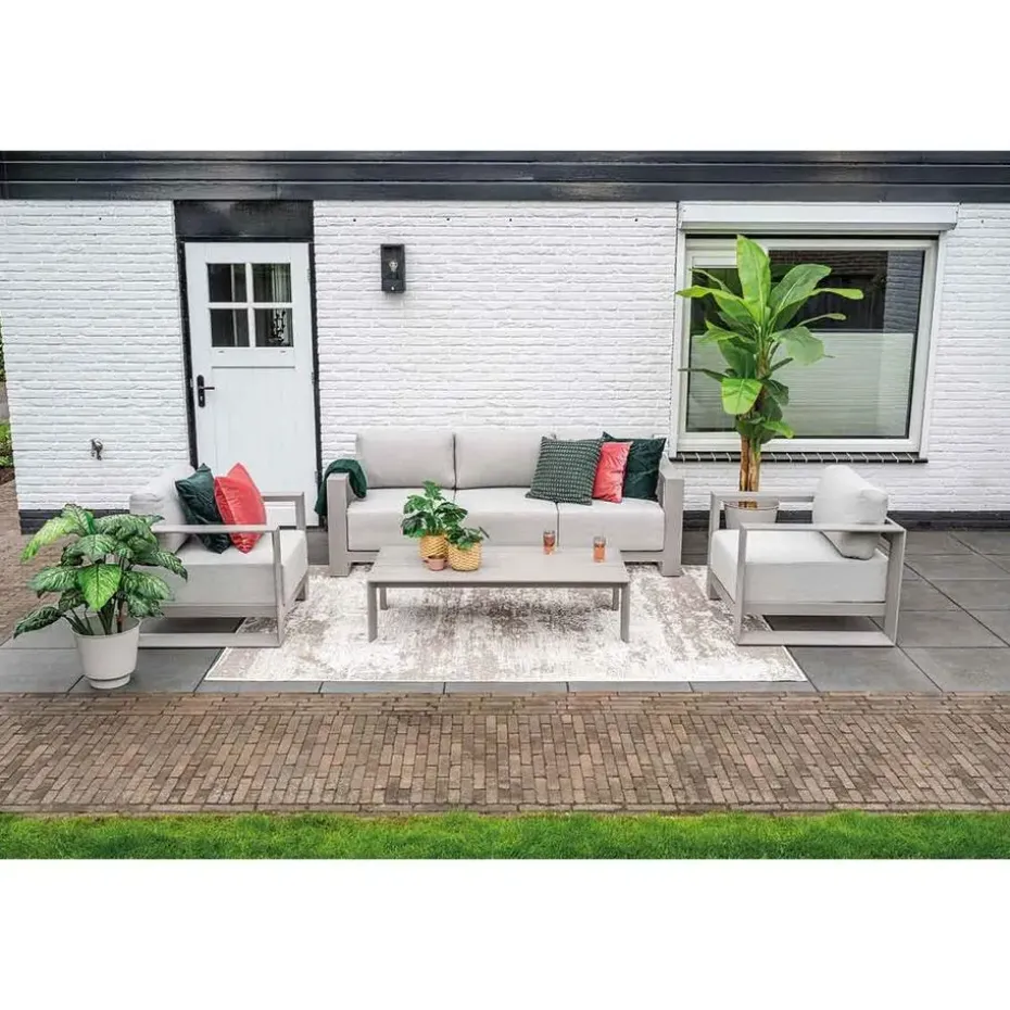 De 3-delige Malakka loungeset met taupe frame combineert een strak design met een comfortabele zit en brede armleuningen.