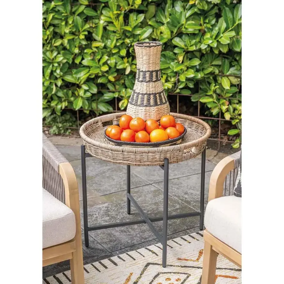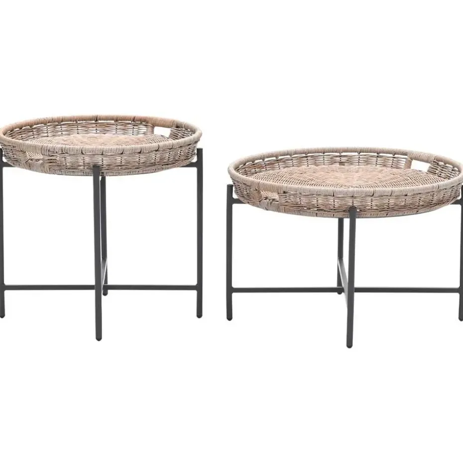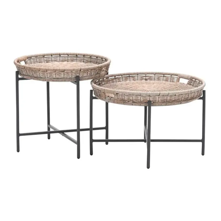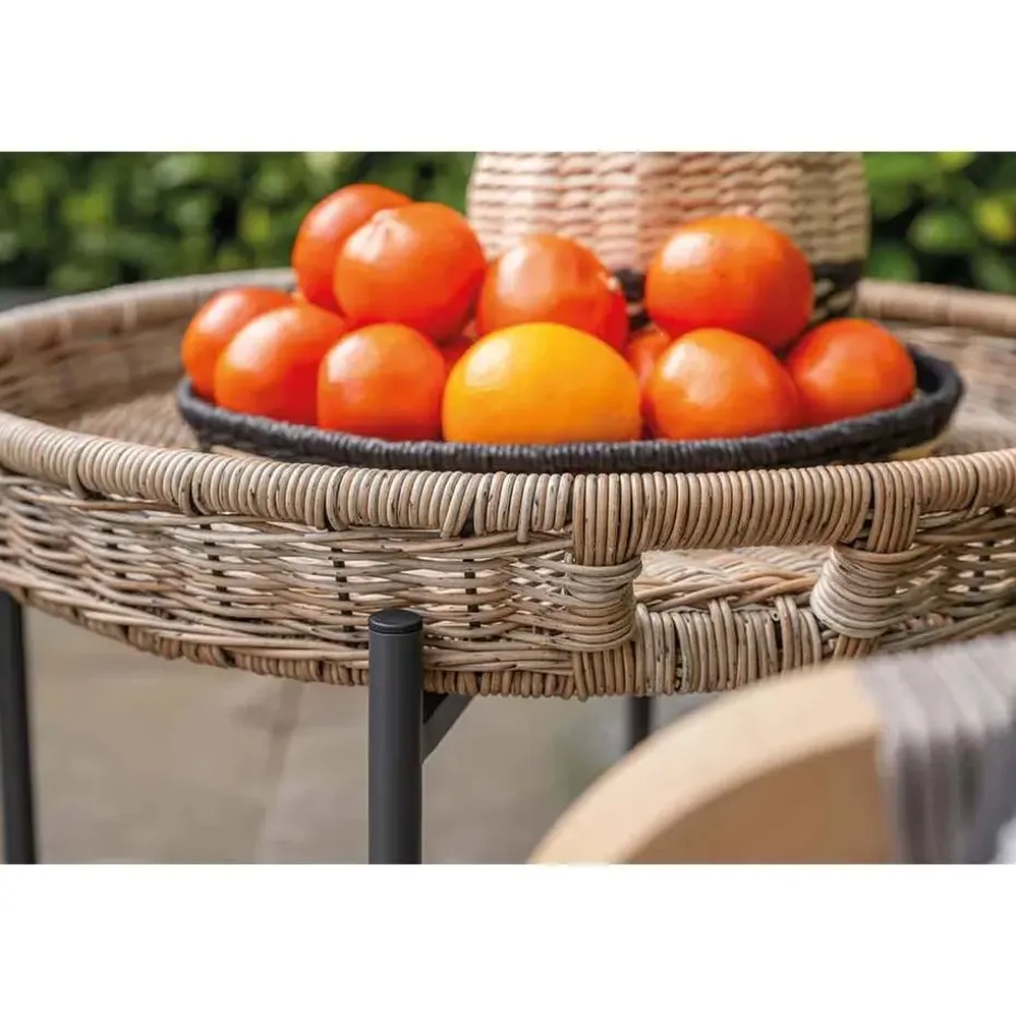 De tafels zijn vervaardigd uit een onderhoudsvrij aluminium binnenframe, omhuld met weerbestendig half rond wicker kunststof vlechtwerkdraad in de kleur naturel rotan. Dit materiaal is stevig, duurzaam en behoudt zijn uitstraling zelfs bij intensief buitengebruik.