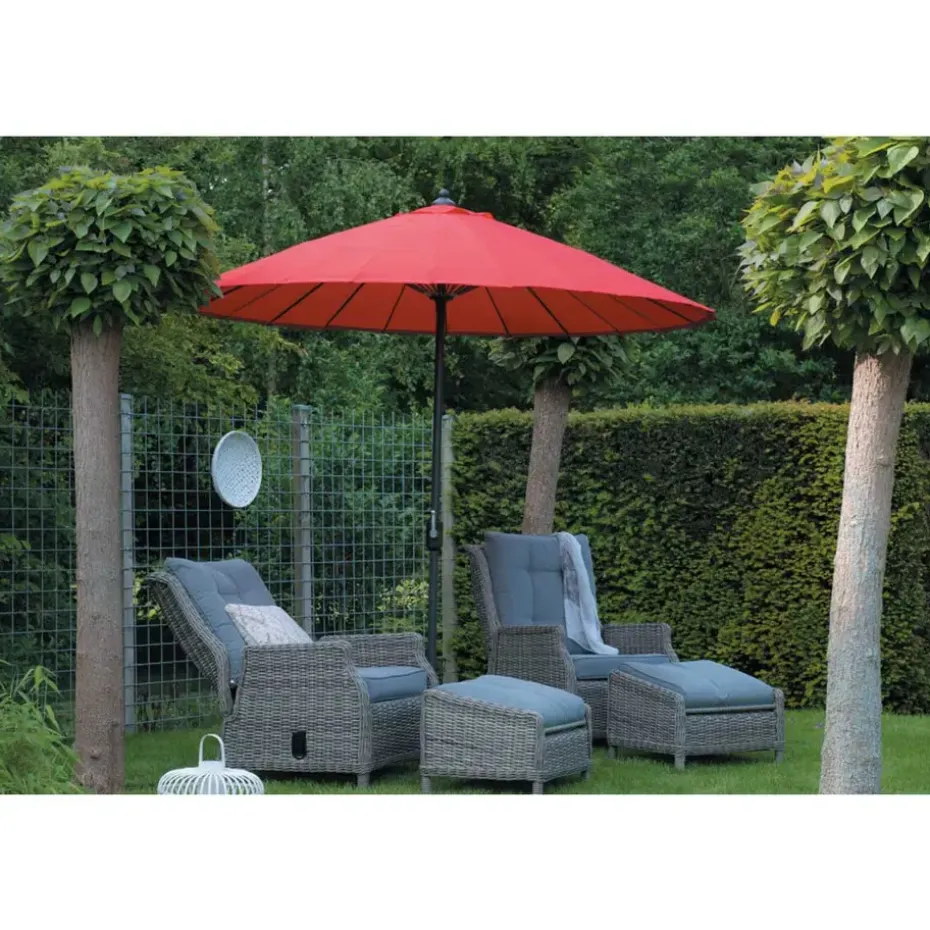 Ben je op zoek naar een parasol, maar wil je iets speciaals? Dan is de Manilla parasol een mooie optie. Het ontwerp van deze hippe parasol doet denken aan een grote paraplu, maar dan in speels en fris design. De Manilla parasol van kwaliteitsmerk Garden Impressions is door zijn vormgeving een populaire parasol. Naast de aparte vormgeving is de parasol uitgevoerd met mooie materialen. Het lichtgewicht frame van de parasol is gemaakt van een stevig aluminium, voorzien van poeder coating. Deze coating is dusdanig sterk dat het kras- en stootvast is. Het 200 grams polyester parasoldoek is voorzien van een windvanger en is spatwaterdicht. De baleinen van de Manilla parasol zijn gemaakt van buigzaam glasfiber, waardoor deze tegen een stootje kunnen. De Manilla parasol van Garden Impressions wordt geleverd exclusief parasolvoet. De diameter van de parasolbuis bedraagt 38 mm. Bij deze parasol kan het beste een 30 of 40 kg voet worden gekocht. Wanneer er veel wind staat dan is het vaak beter om de zwaardere voet aan te schaffen. Denk bijvoorbeeld aan plaatsing op een dakterras of bij een boerderij.
