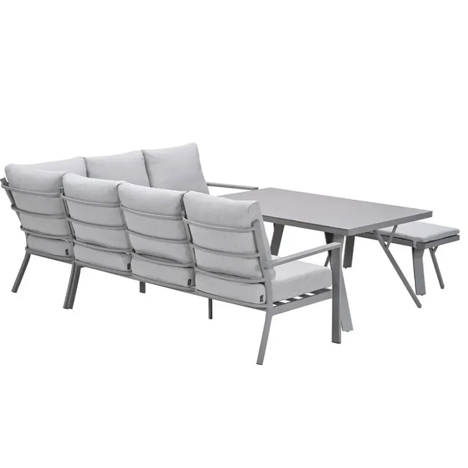 De Senja lounge dining set is vervaardigd uit een onderhoudsvrij en weerbestendig aluminium met een stevige taupe kleurige poedercoating. Aluminium heeft als voordeel dat het onderhoudsvrij is, wanneer de set vies is geworden door bijvoorbeeld opspattend regenwater kan je dit eenvoudig schoonmaken met een sopje van groene zeep en een zachte doek. Ideaal! De lounge dining set is uit te breiden met een lounge dining stoel en een sportbankje. De tafel heeft een latten structuur en brede platte tafelpoten, hierdoor heeft de tafel een strak design. De lounge dining set is voorzien van verstelbare pootdopjes, hierdoor is deze makkelijk waterpas te zetten.