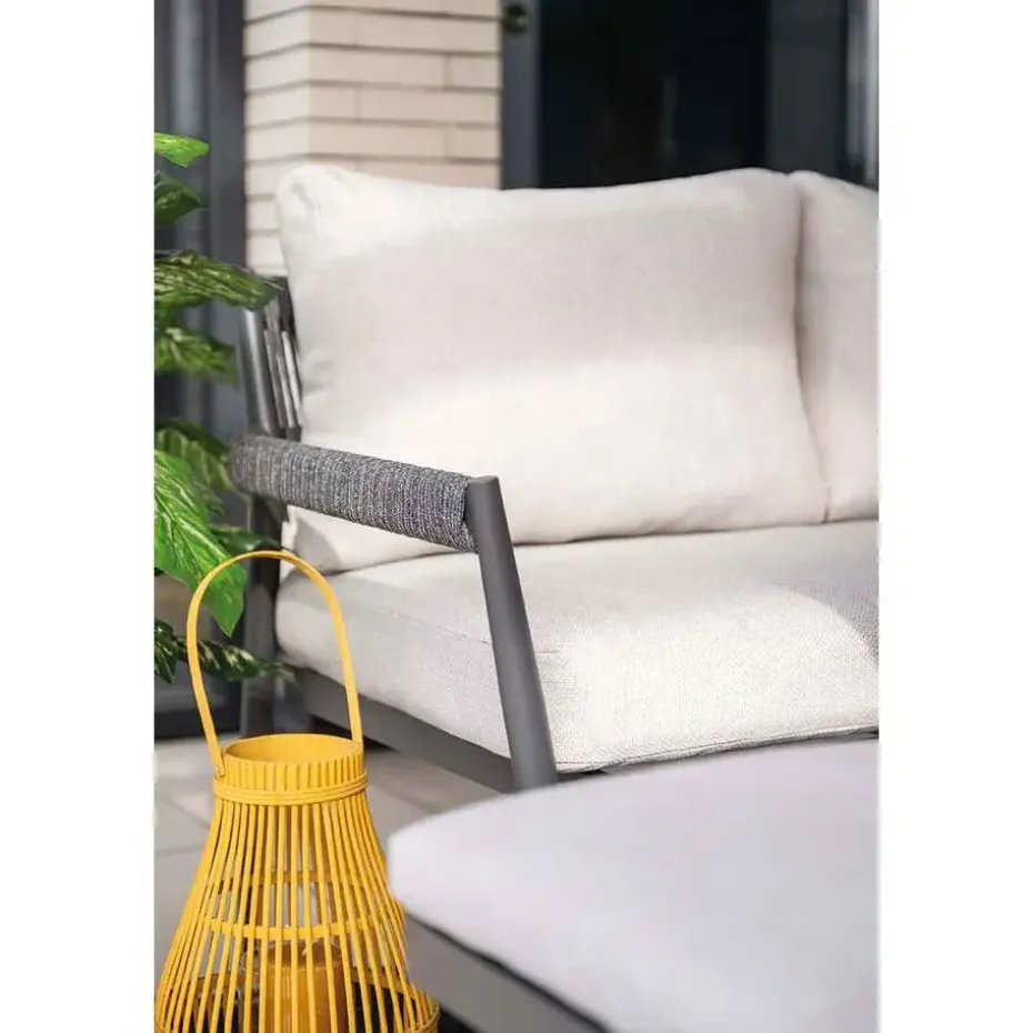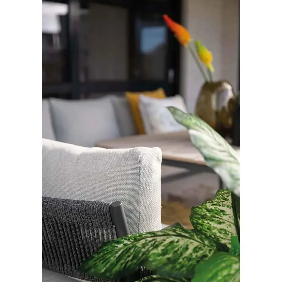 Deze complete lounge dining set is vervaardigd uit een weerbestendig en onderhoudsvrij frame van aluminium. Het frame is voorzien van een stevige donker grijze poedercoating. Dit frame heeft een mooie afwerking van rope touw, dit touw heeft een een dark grey kleur. Samen geeft dit met de meegeleverde kussens een prachtig uiterlijk aan de lounge dining set.