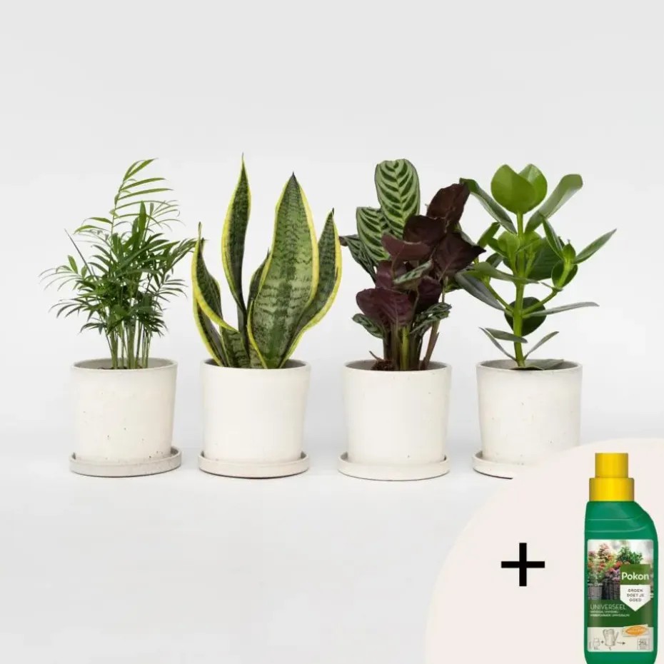 Tover elke kamer om tot een levende jungle met deze mooie en supermakkelijke planten. Deze kamerplantenmix bestaat uit de makkelijkste kamerplanten om te kweken en te verzorgen. Deze kamerplanten zijn uitzonderlijk robuuste kamerplanten die heel weinig water nodig hebben. Perfect als je niet veel tijd hebt of meestal vergeet ze water te geven! Bovendien zien ze er ook nog eens geweldig uit. De mix bevat de volgende planten: Ctenanthe Burle-Marxii, Chamaedorea Elegance, Clusia Rosea ‘Princess’ en Sansevieria.