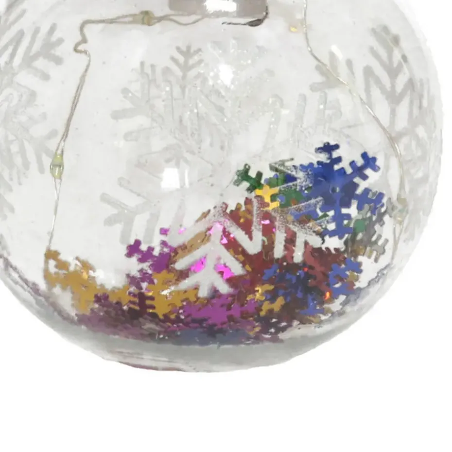 Verlichte kerstbal met sneeuwvlok confetti/strooisel aan de binnenkant. Deze prachtige kerstbal, met een diameter van 8 cm, straalt een warme gloed uit dankzij de 5 LED lampjes aan de binnenkant, waardoor je kerstboom een magische uitstraling krijgt. Het unieke kenmerk van deze kerstbal is de sneeuwvlok confetti die zich binnenin bevindt, waardoor een betoverend winters tafereel ontstaat telkens wanneer het licht schijnt. De zachte schittering van de confetti voegt een vleugje elegantie toe aan je kerstboomdecoratie en geeft een sfeer van verwondering en magie. Gemaakt van kunststof en met zijn klassieke formaat, past hij perfect in elke kerstboom en kan hij ook worden gebruikt als decoratief accent op kransen, guirlandes of tafelstukken. Inclusief knoopcel batterijen.