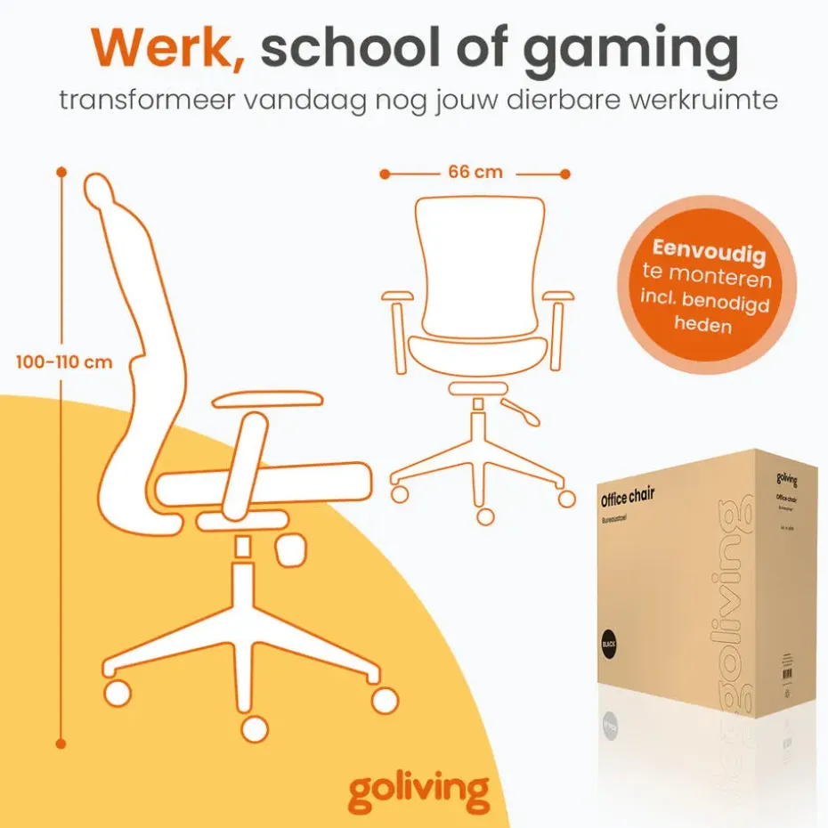 Een fijne werkplek is cruciaal om goed te kunnen presteren. Dat begint natuurlijk bij een degelijke bureaustoel. De bureaustoel is volledig te verstellen, en bevat ademend materiaal op de rugleuning. Deze stoel van Goliving is daarnaast uitgevoerd met een lendensteun en armsteunen, voor een ideale zitpositie. Je rug en postuur zullen je dankbaar zijn!